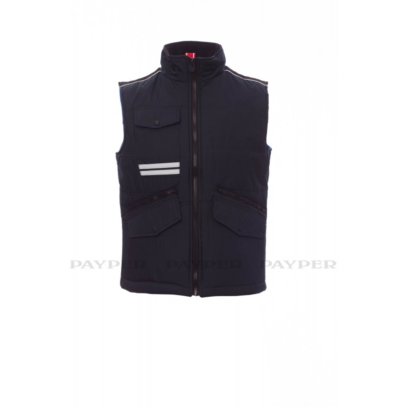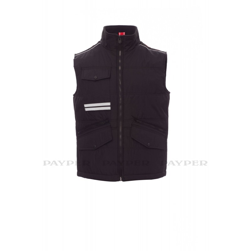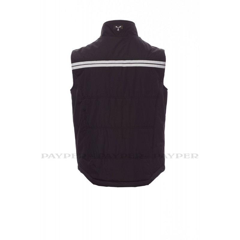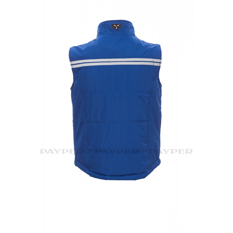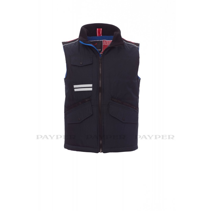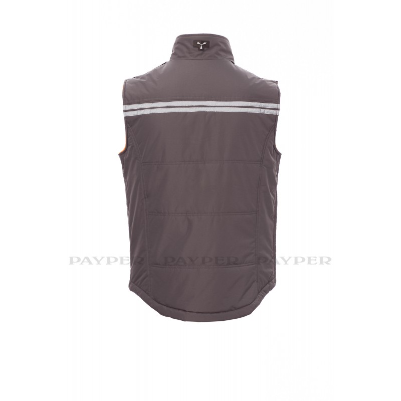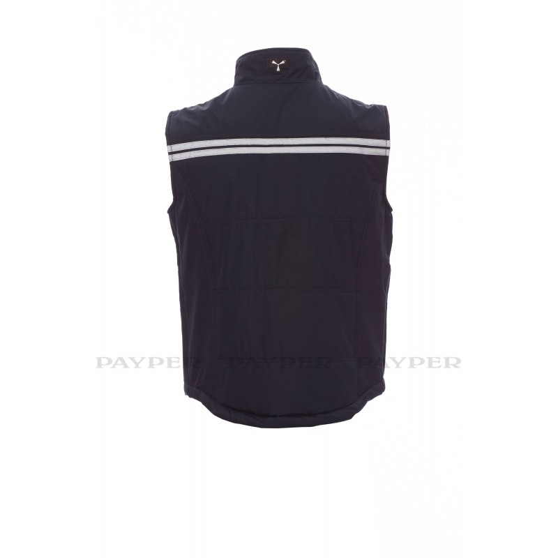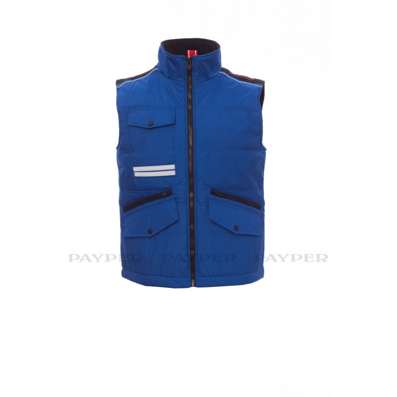 Chaleco unisex, cremallera de 8 mm de plástico con cursor de metal con tapeta y botones de plástico, parte posterior contorneada, dos bolsillos exteriores LOCK SYSTEM y dos bolsillos con cremallera, bolsillos sesgados para fácil acceso, un bolsillo a la altura del pecho para smartphone y anilla de soporte para tarjeta de identificación, bandas reflectantes en el bolsillo y en la parte trasera. Interior: acolchado, forro polar de contraste en espalda y cuello, un bolsillo, cremallera interior para facilitar la impresión y el bordado.