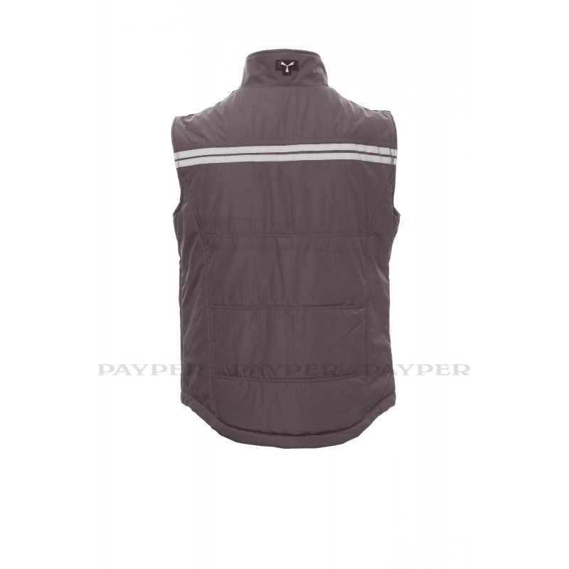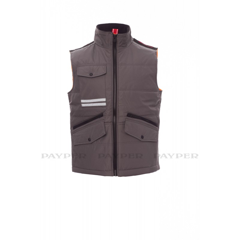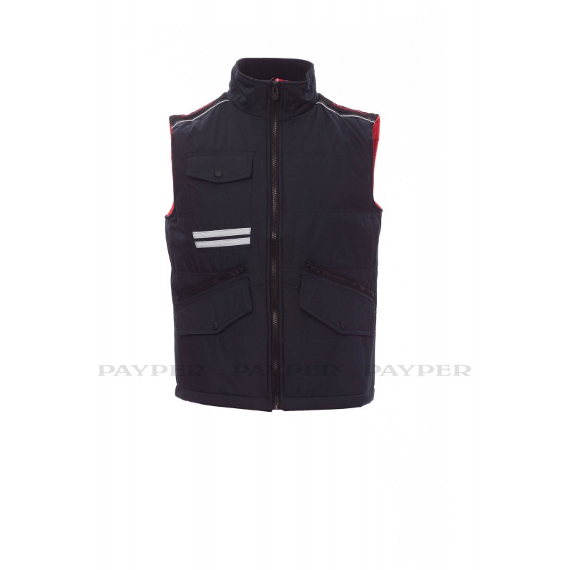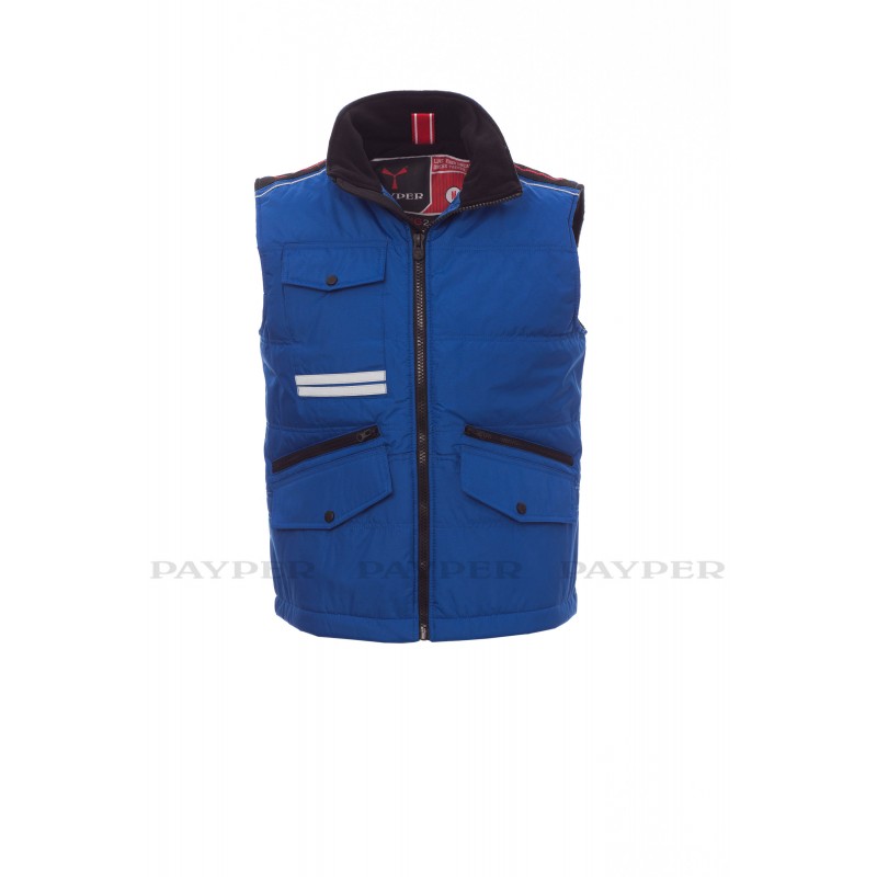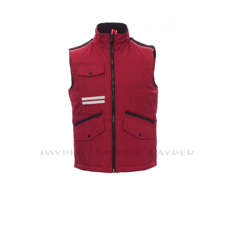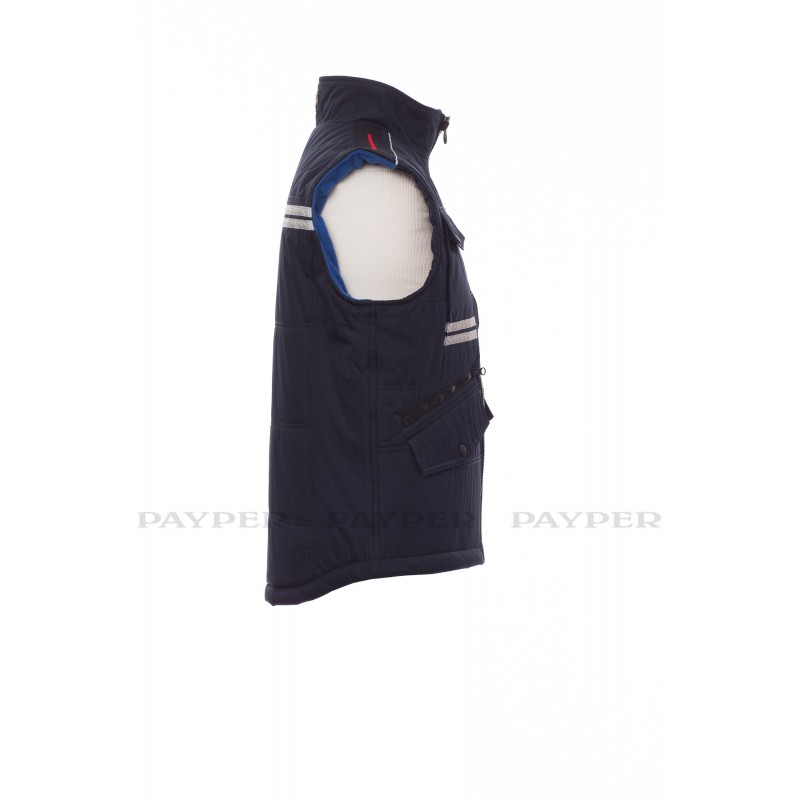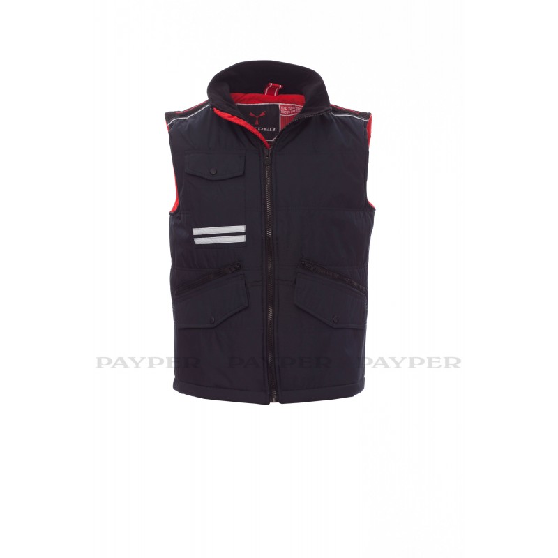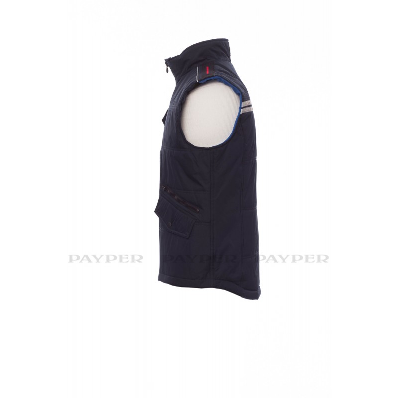 Chaleco unisex, cremallera de 8 mm de plástico con cursor de metal con tapeta y botones de plástico, parte posterior contorneada, dos bolsillos exteriores LOCK SYSTEM y dos bolsillos con cremallera, bolsillos sesgados para fácil acceso, un bolsillo a la altura del pecho para smartphone y anilla de soporte para tarjeta de identificación, bandas reflectantes en el bolsillo y en la parte trasera. Interior: acolchado, forro polar de contraste en espalda y cuello, un bolsillo, cremallera interior para facilitar la impresión y el bordado.