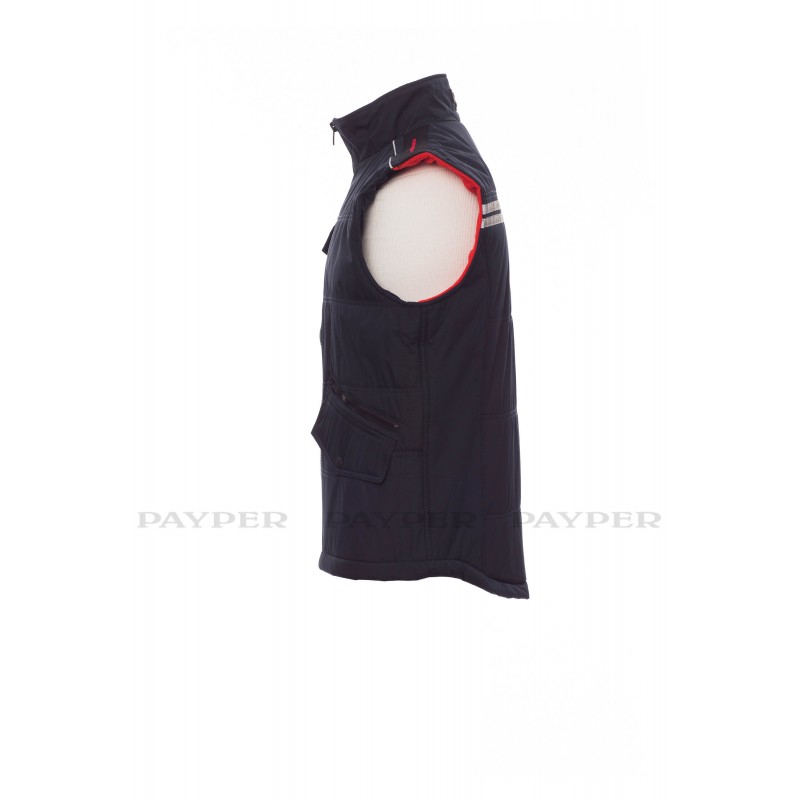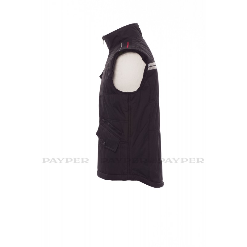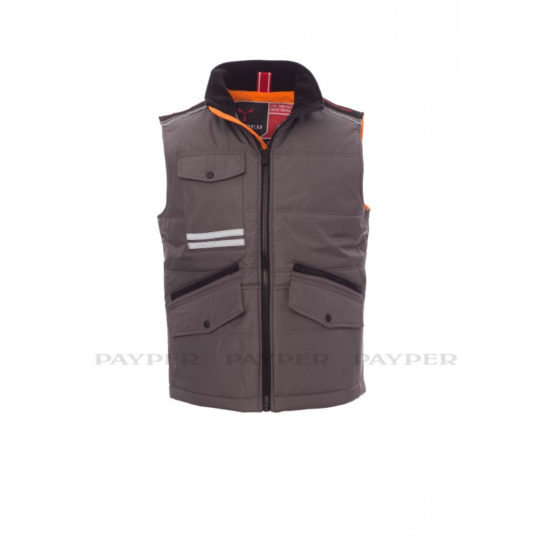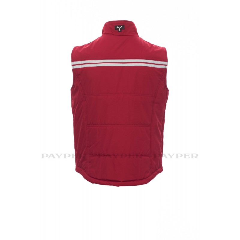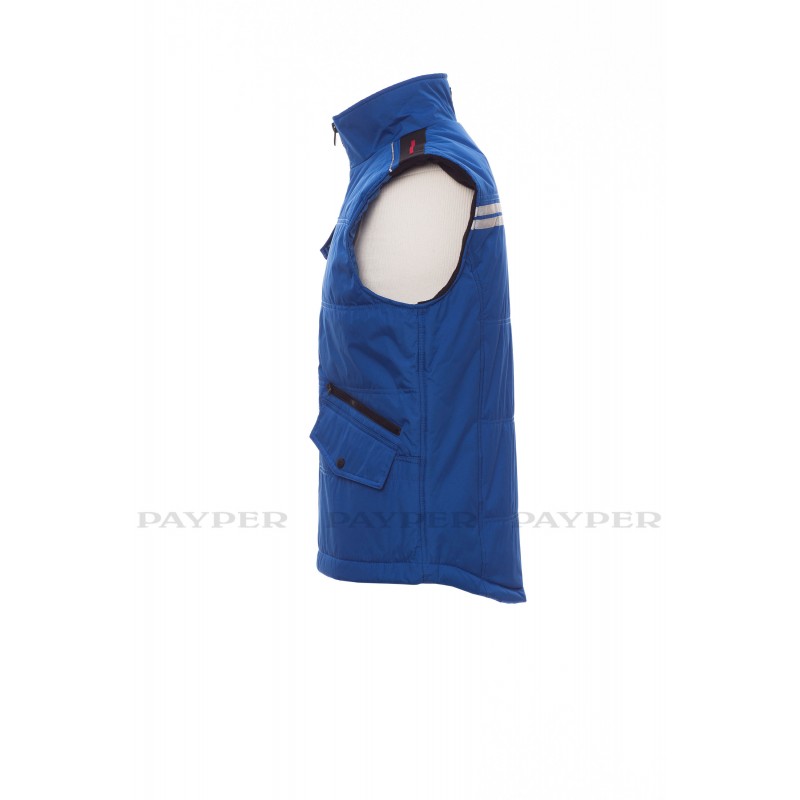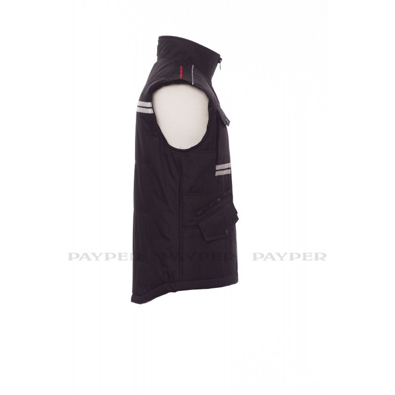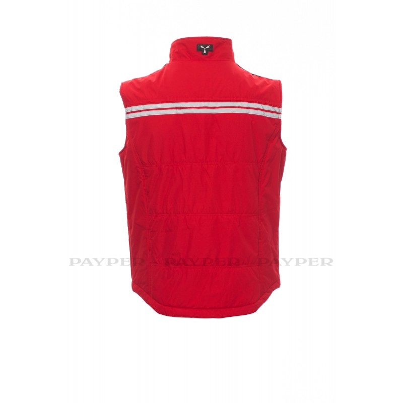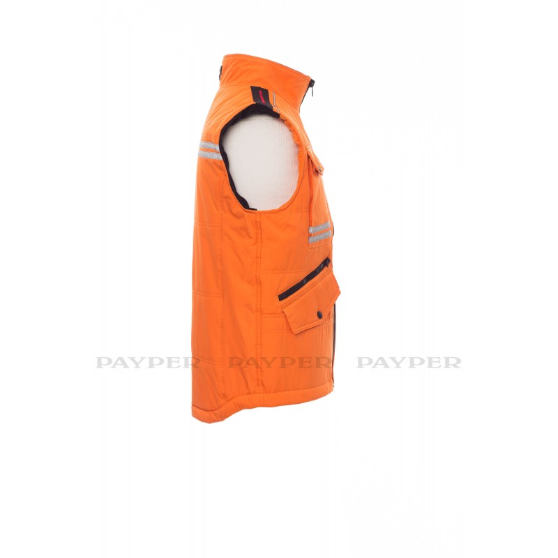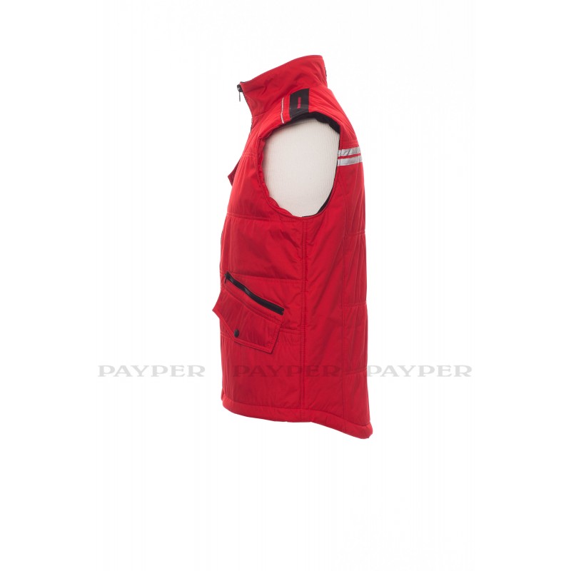 Chaleco unisex, cremallera de 8 mm de plástico con cursor de metal con tapeta y botones de plástico, parte posterior contorneada, dos bolsillos exteriores LOCK SYSTEM y dos bolsillos con cremallera, bolsillos sesgados para fácil acceso, un bolsillo a la altura del pecho para smartphone y anilla de soporte para tarjeta de identificación, bandas reflectantes en el bolsillo y en la parte trasera. Interior: acolchado, forro polar de contraste en espalda y cuello, un bolsillo, cremallera interior para facilitar la impresión y el bordado.