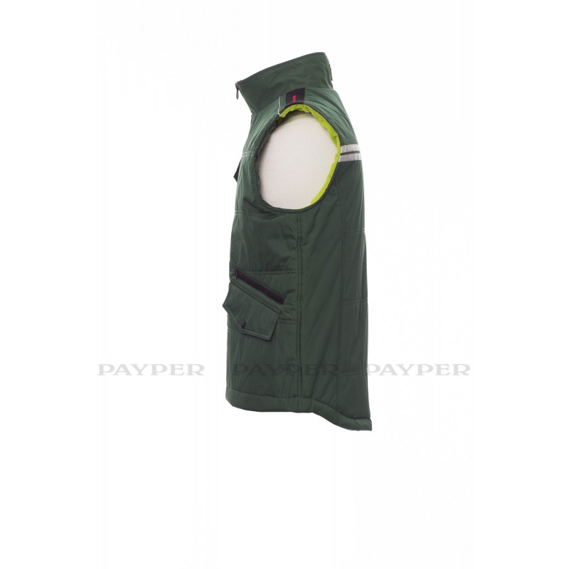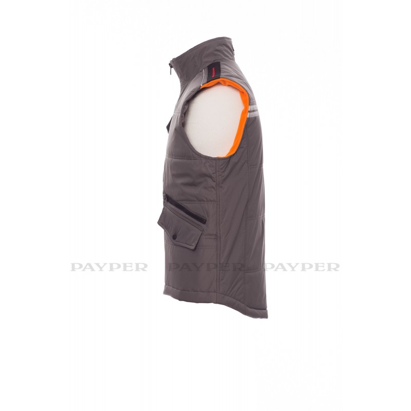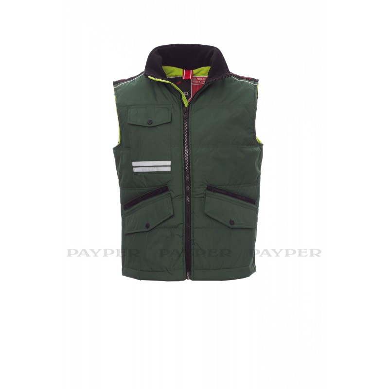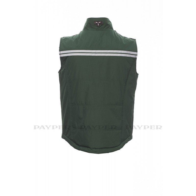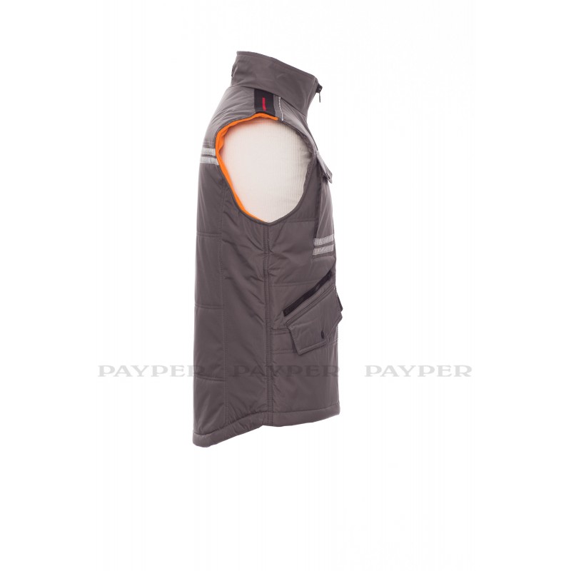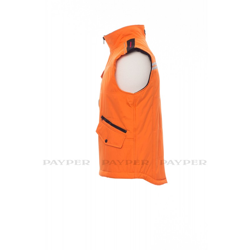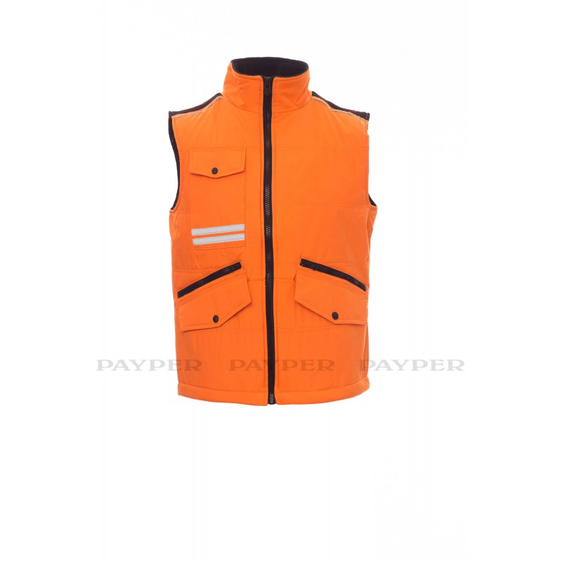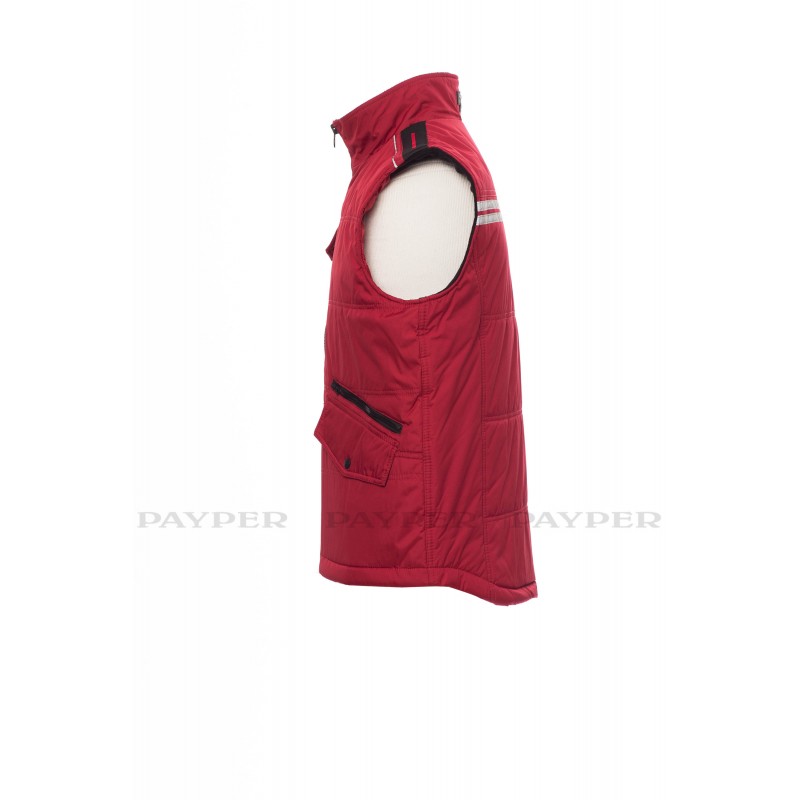 Chaleco unisex, cremallera de 8 mm de plástico con cursor de metal con tapeta y botones de plástico, parte posterior contorneada, dos bolsillos exteriores LOCK SYSTEM y dos bolsillos con cremallera, bolsillos sesgados para fácil acceso, un bolsillo a la altura del pecho para smartphone y anilla de soporte para tarjeta de identificación, bandas reflectantes en el bolsillo y en la parte trasera. Interior: acolchado, forro polar de contraste en espalda y cuello, un bolsillo, cremallera interior para facilitar la impresión y el bordado.