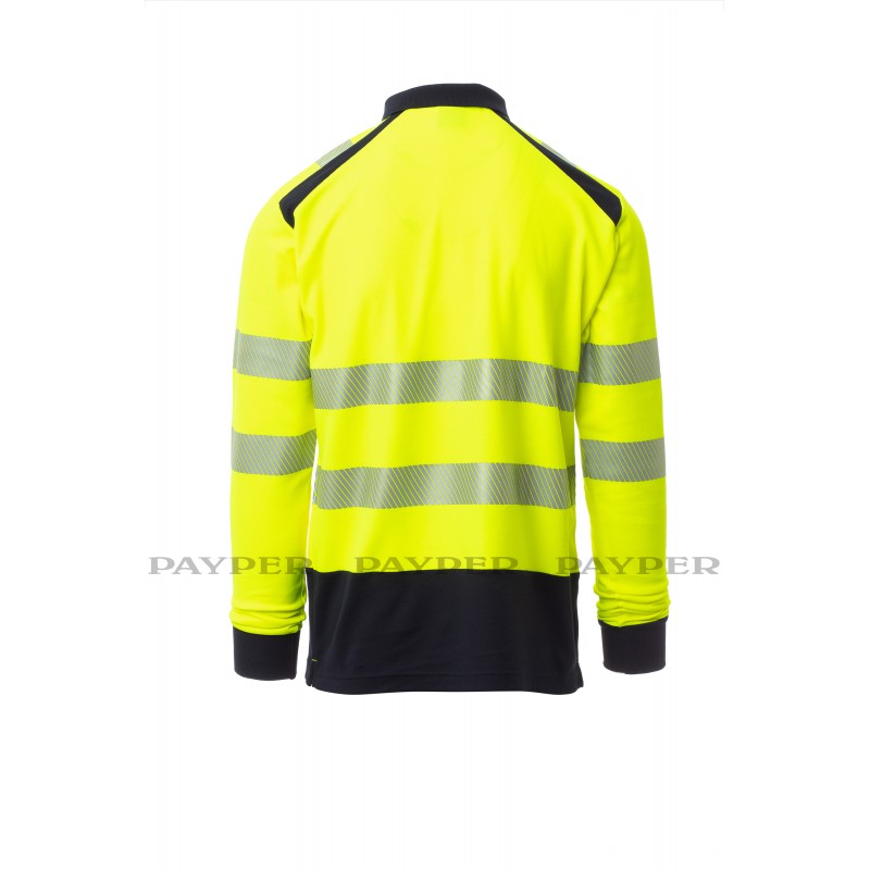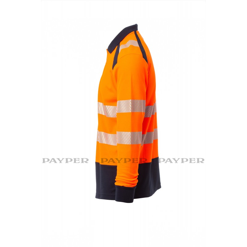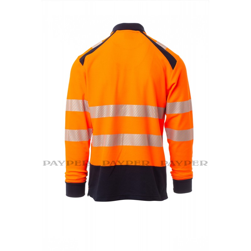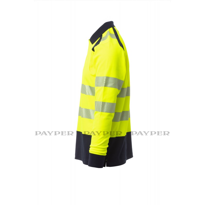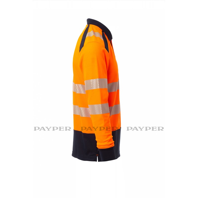 Polo bicolor de alta visibilidad, de manga larga. Cuello con 3 botones, con canalé y costuras cubiertas. Aberturas laterales. Bandas retrorreflectantes segmentadas y termoselladas para facilitar el movimiento. El tejido, confeccionado con algodón en el interior y poliéster en el exterior, garantiza una gran transpirabilidad y comodidad, así como una mayor durabilidad.