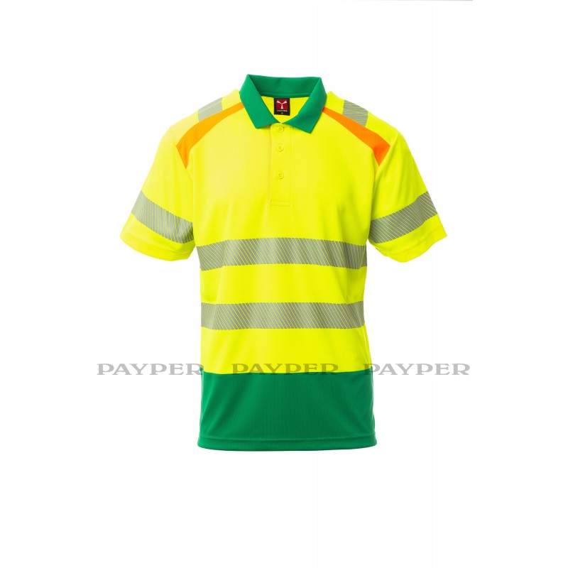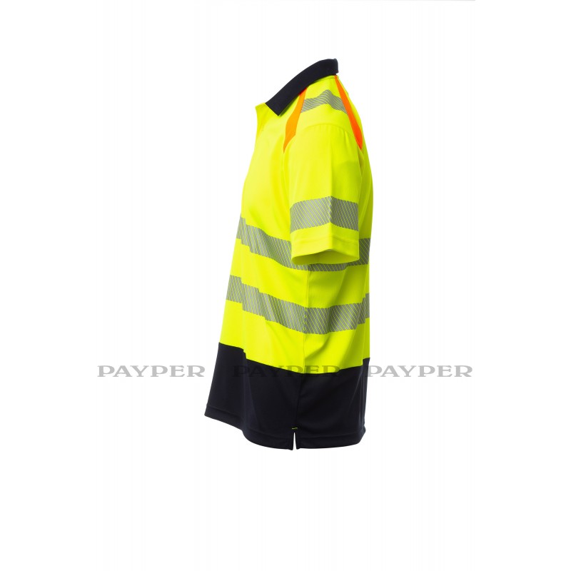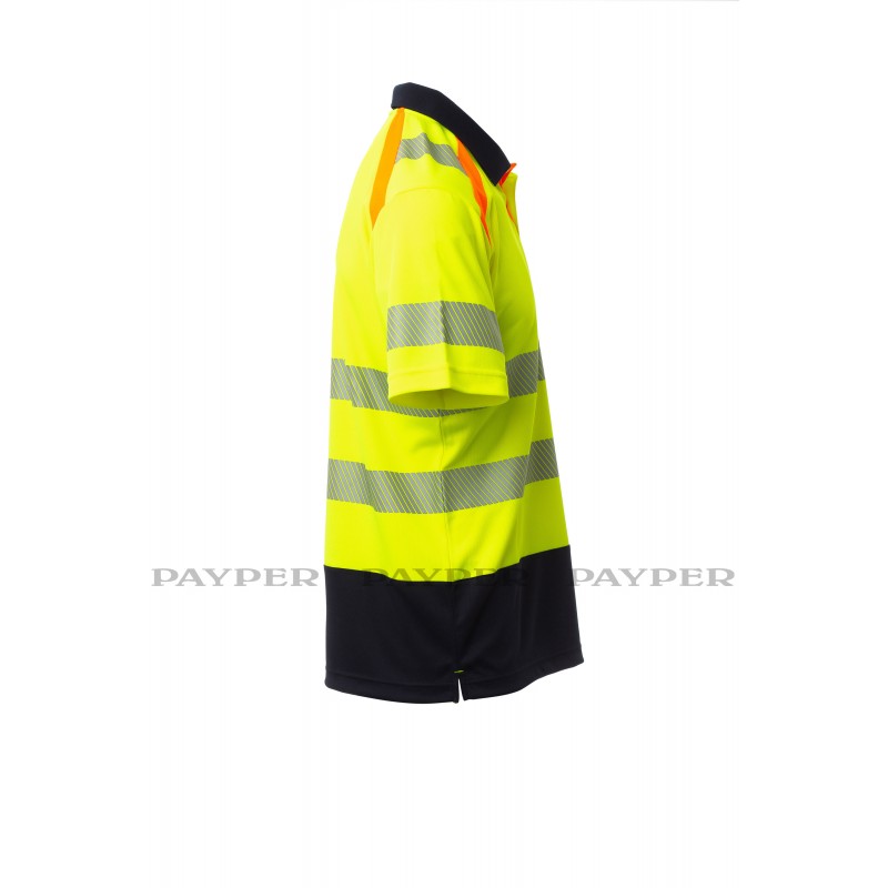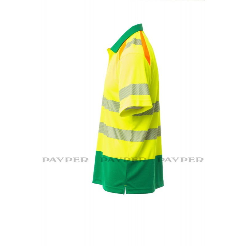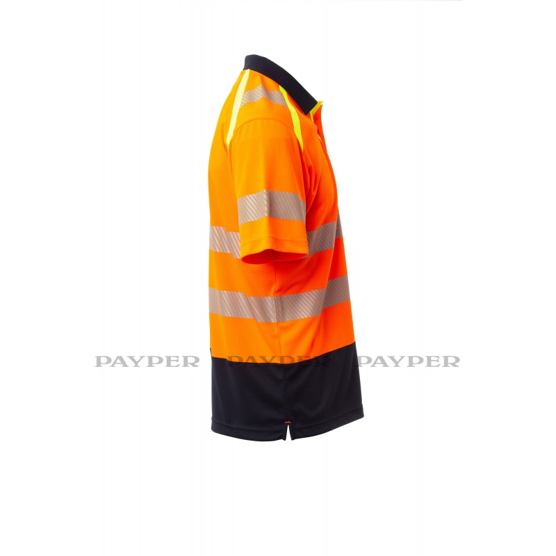 Polo bicolor de alta visibilidad, de manga corta. Cuello con 3 botones, con canalé y costuras cubiertas, abertura en contraste. Cuello de canalé. Bandas retrorreflectantes segmentadas y termoselladas en hombros, mangas y cintura para facilitar el movimiento. Aberturas laterales.