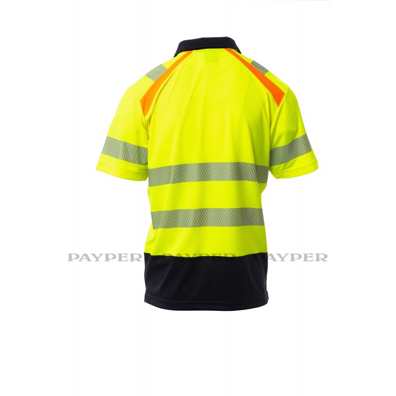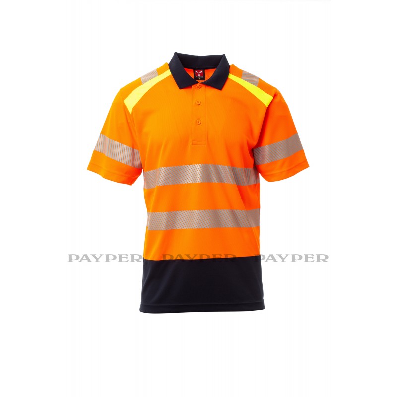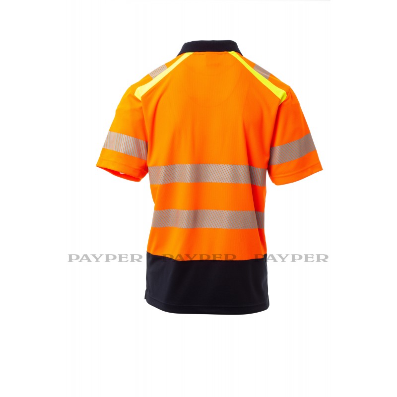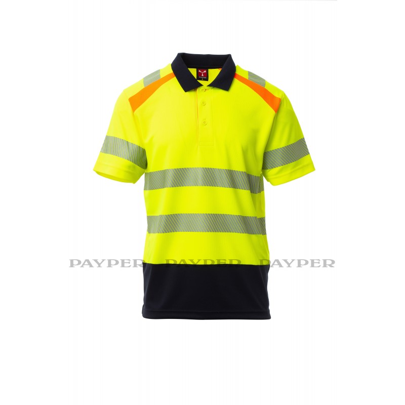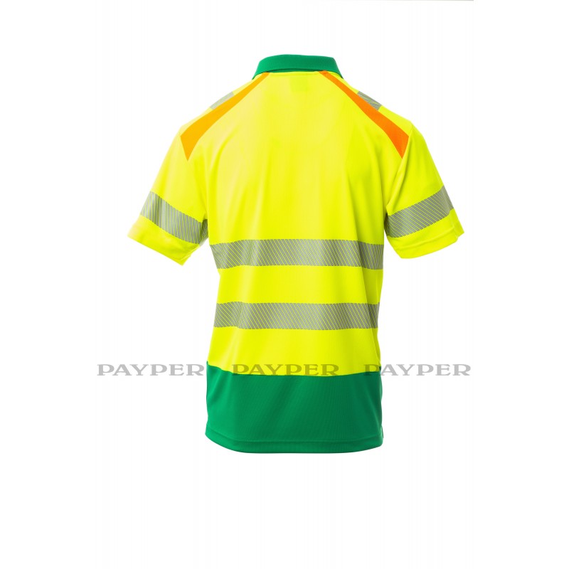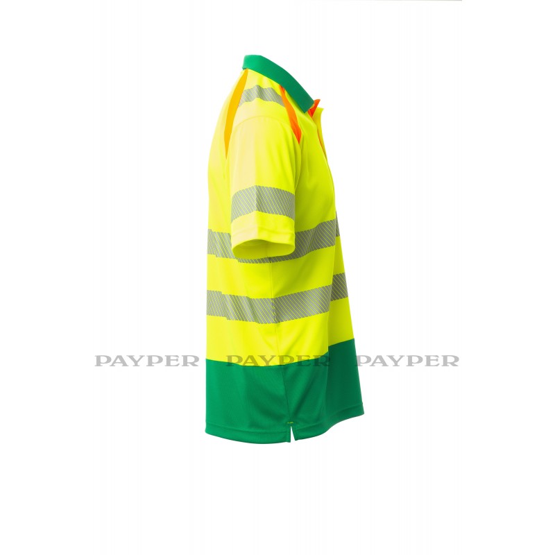 Polo bicolor de alta visibilidad, de manga corta. Cuello con 3 botones, con canalé y costuras cubiertas, abertura en contraste. Cuello de canalé. Bandas retrorreflectantes segmentadas y termoselladas en hombros, mangas y cintura para facilitar el movimiento. Aberturas laterales.