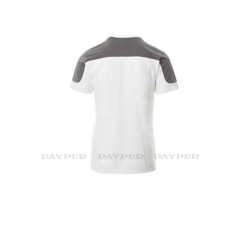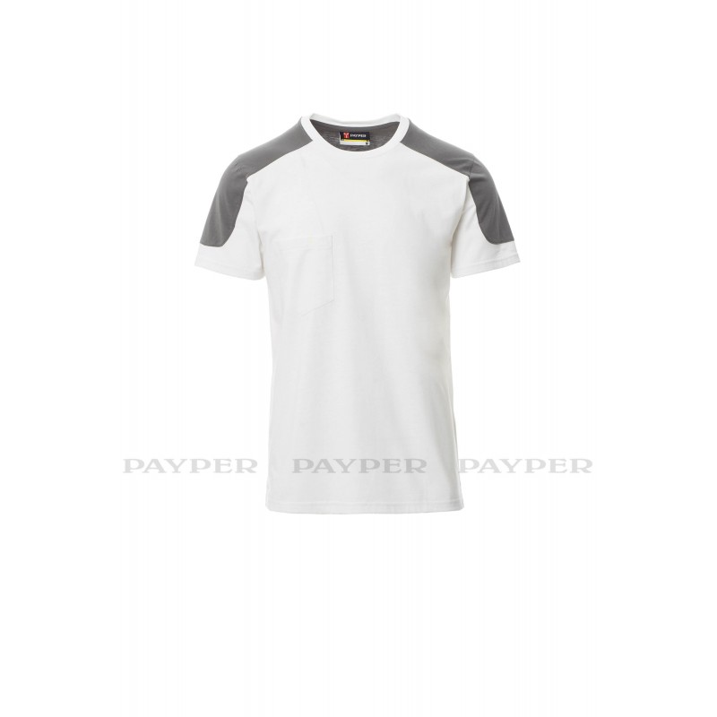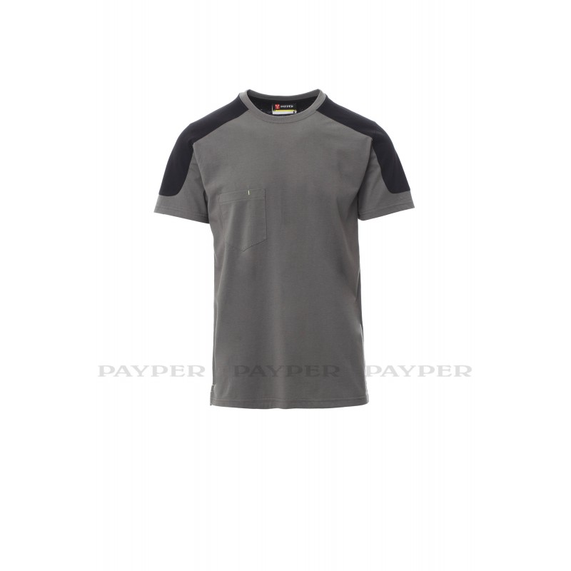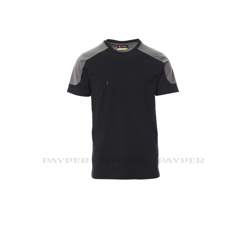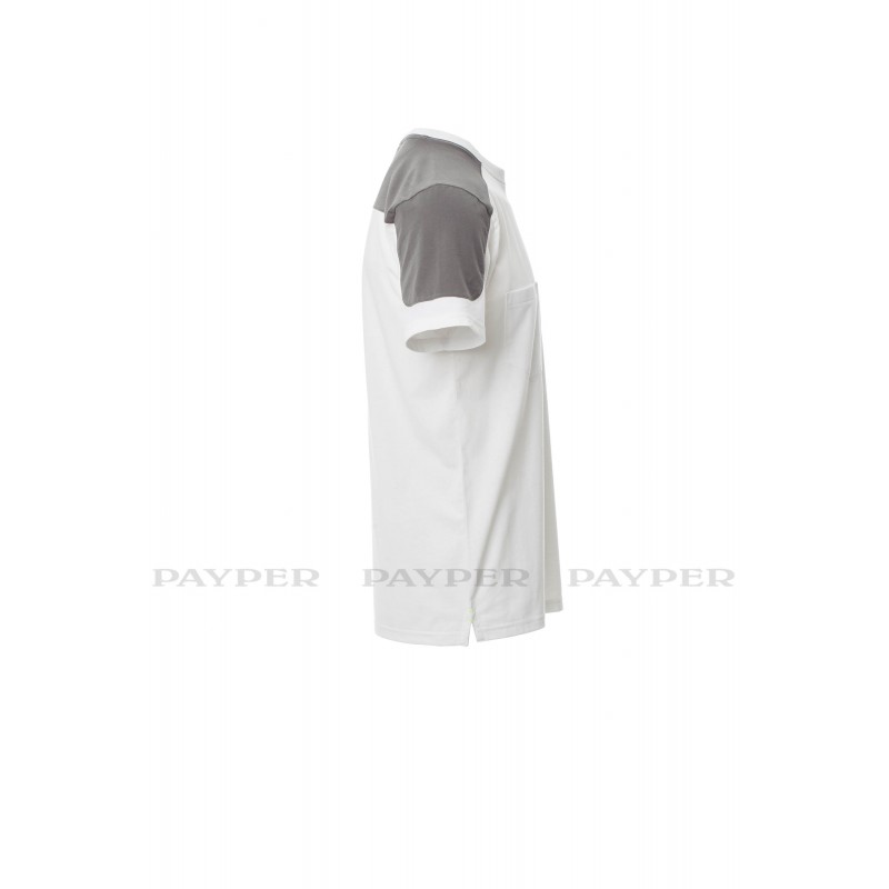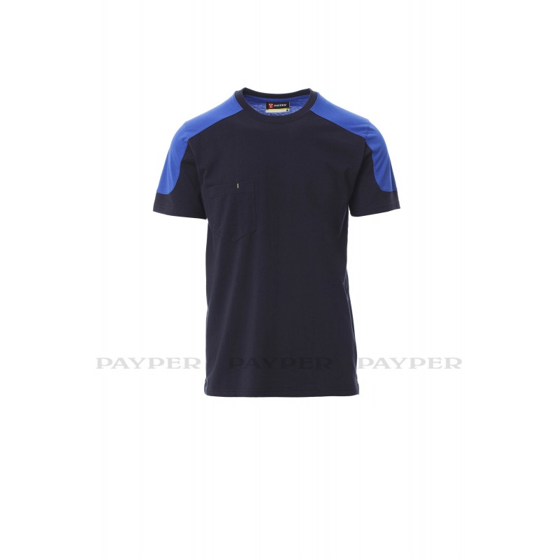 Camiseta bicolor, bolsillo en el pecho con soporte para bolígrafos, costuras del cuello cubiertas y cinta de refuerzo lateral.