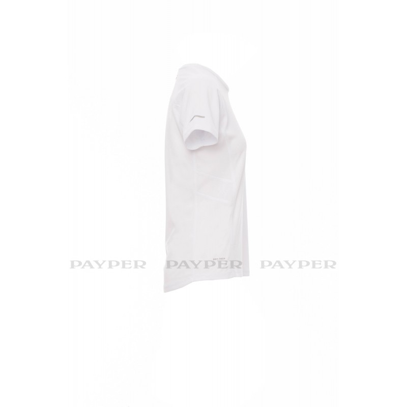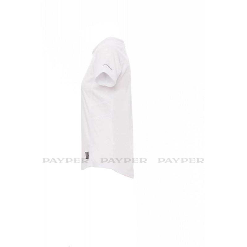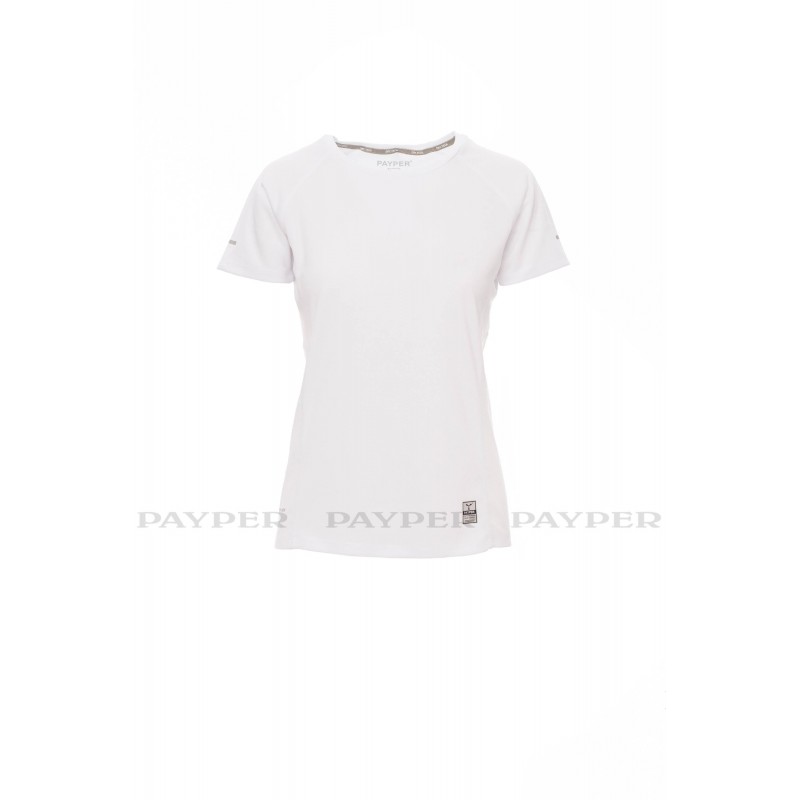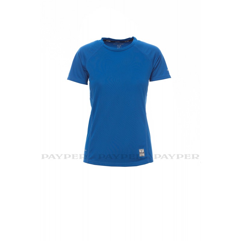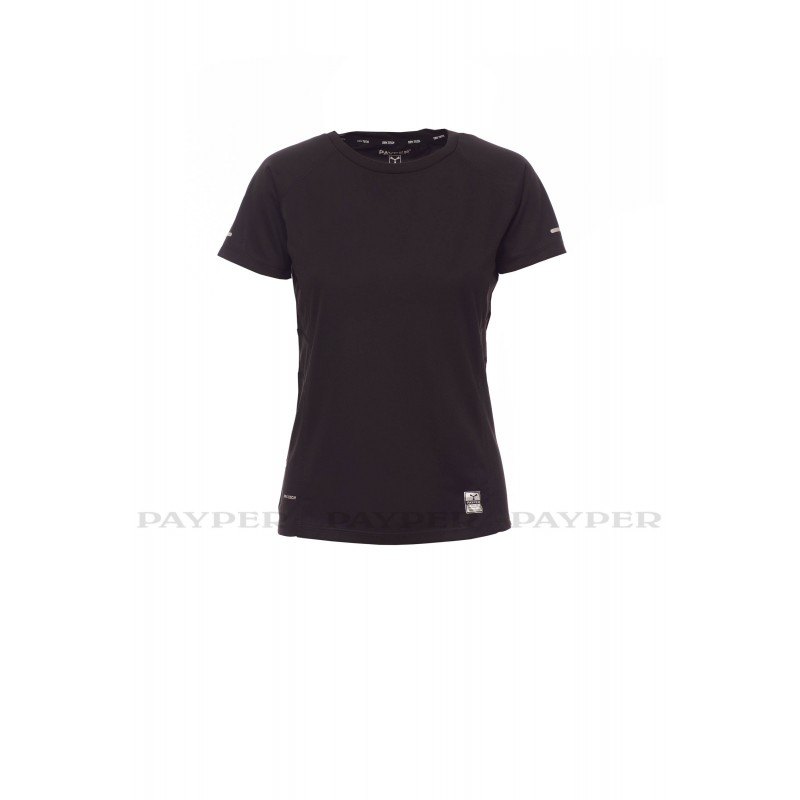 Camiseta técnica deportiva ceñida para mujer con mangas ranglán, doble costura lateral para mayor confort, fondo contorneado más largo en la parte posterior, aplicación reflectante en las mangas y en la parte posterior del cuello, etiqueta de transferencia.