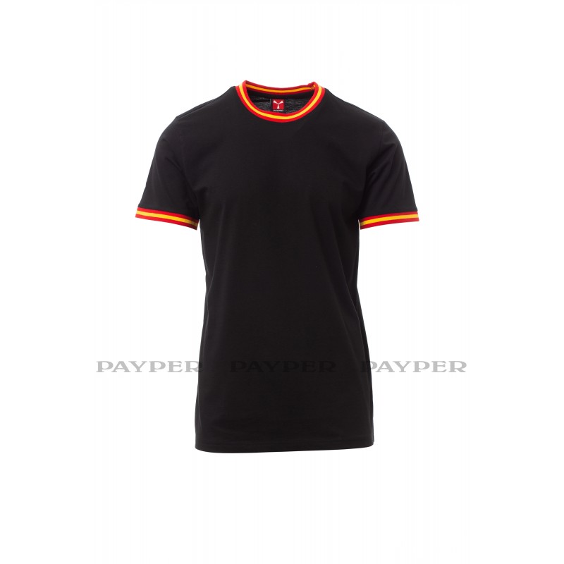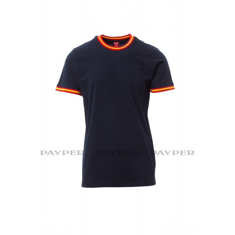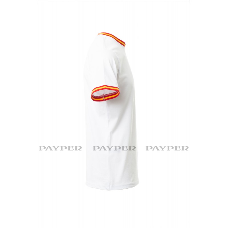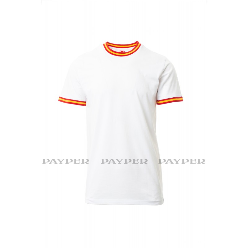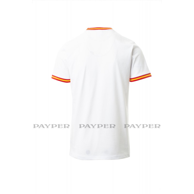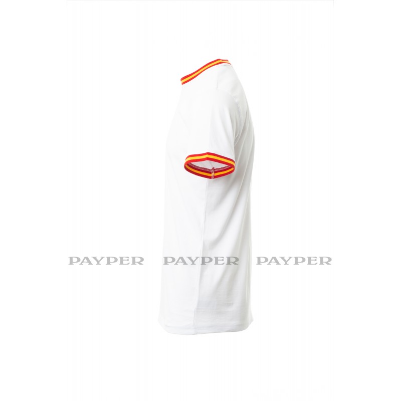 Camiseta de cuello redondo y manga corta para hombre, cuello y extremo de las mangas de contraste (colores de la bandera), banda elástica en cuello de elastano de 2,3 cm con pespunte superior en la parte delantera, cinta de refuerzo de hombro a hombro.