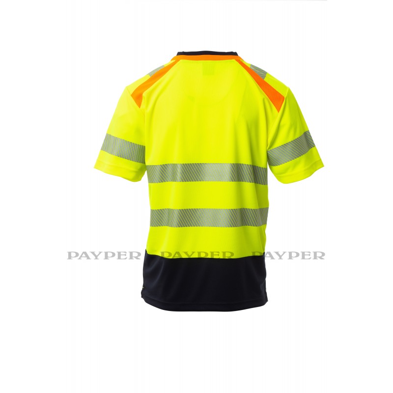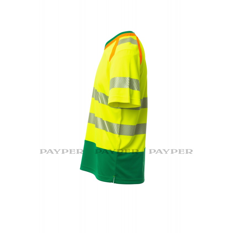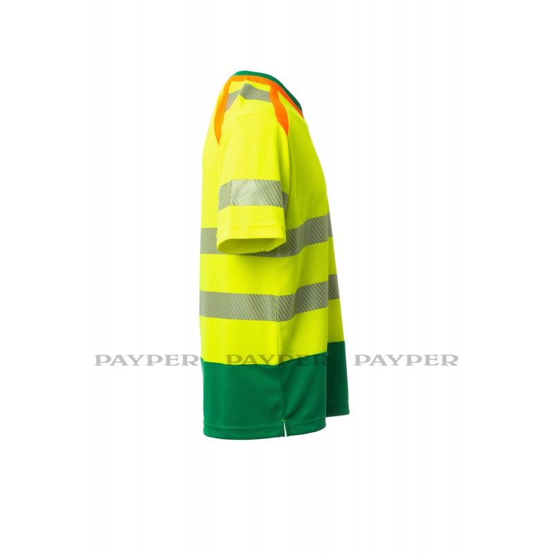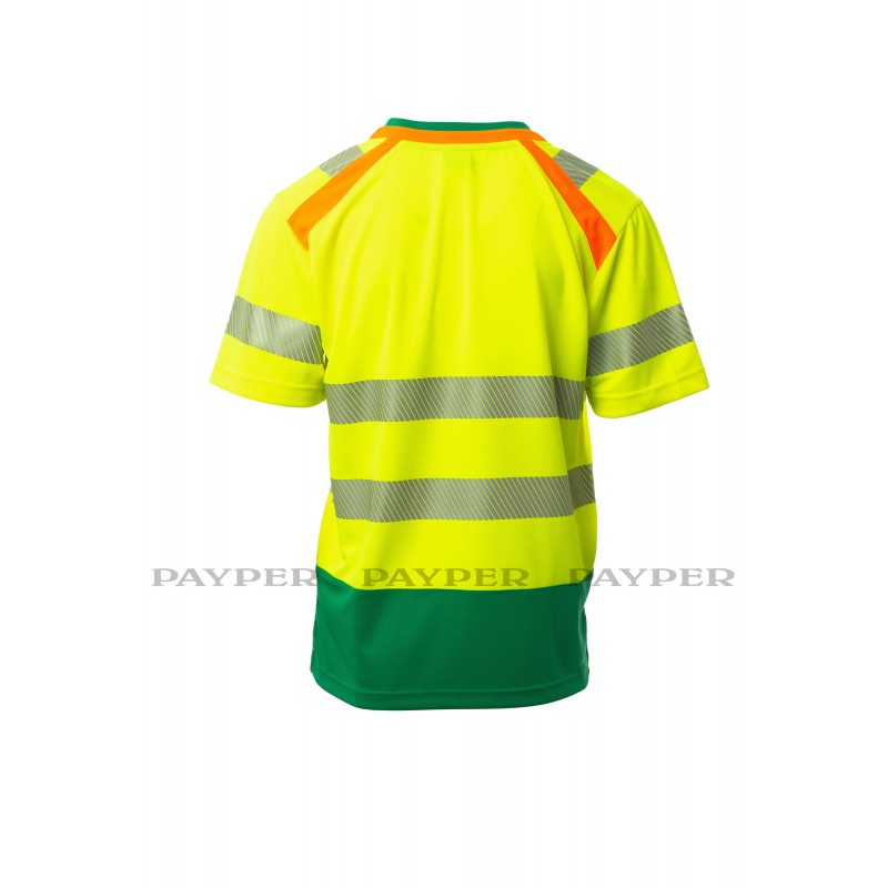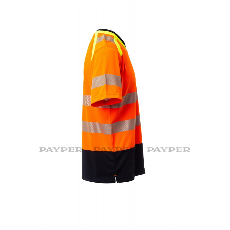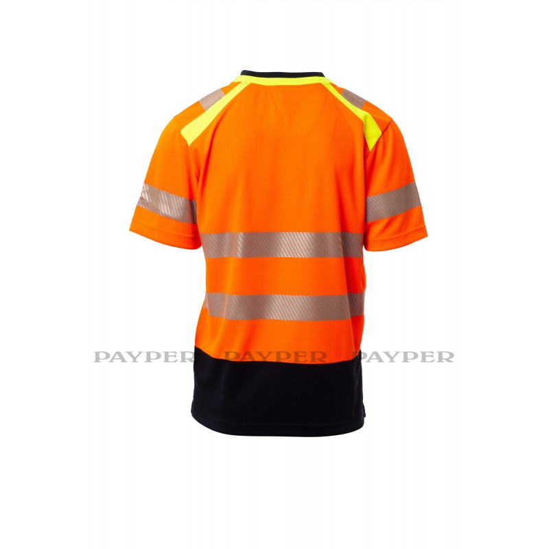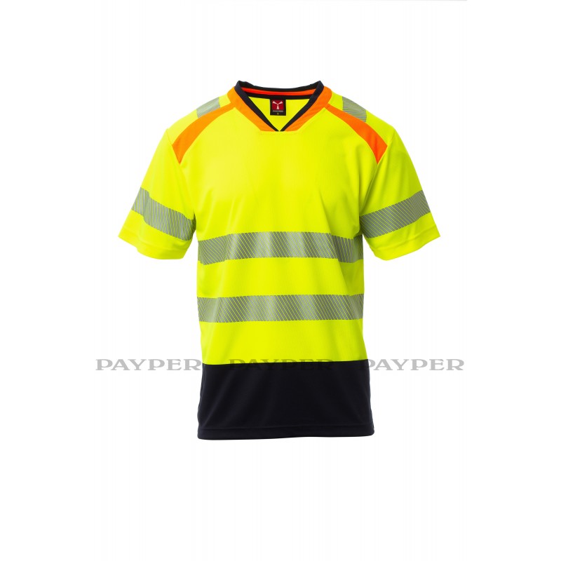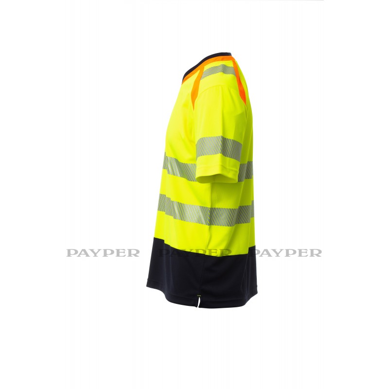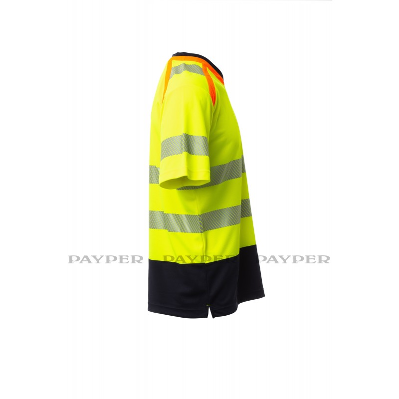 Camiseta bicolor de alta visibilidad, de manga corta, con cuello en V. Cuello de canalé en contraste y costuras cubiertas. Bandas retrorreflectantes segmentadas y termoselladas en hombros, mangas y cintura para facilitar el movimiento. Cinta de refuerzo en color de contraste. Aberturas laterales.