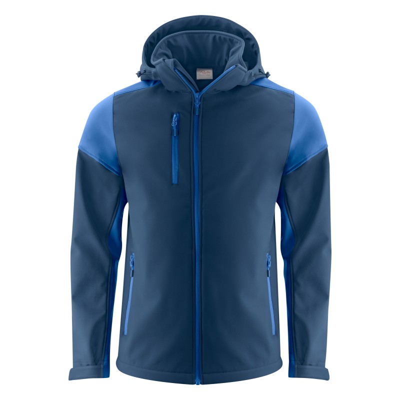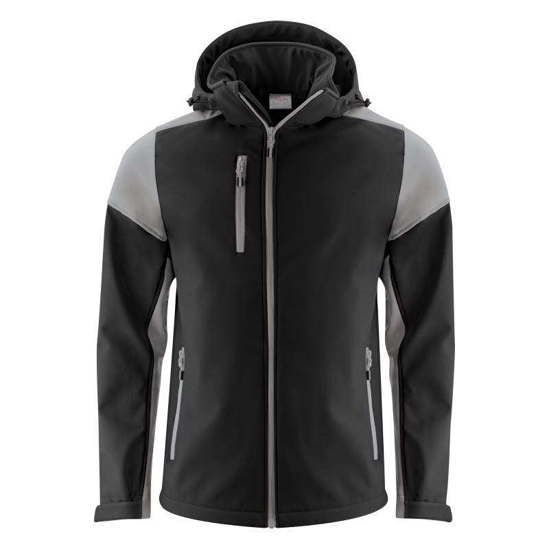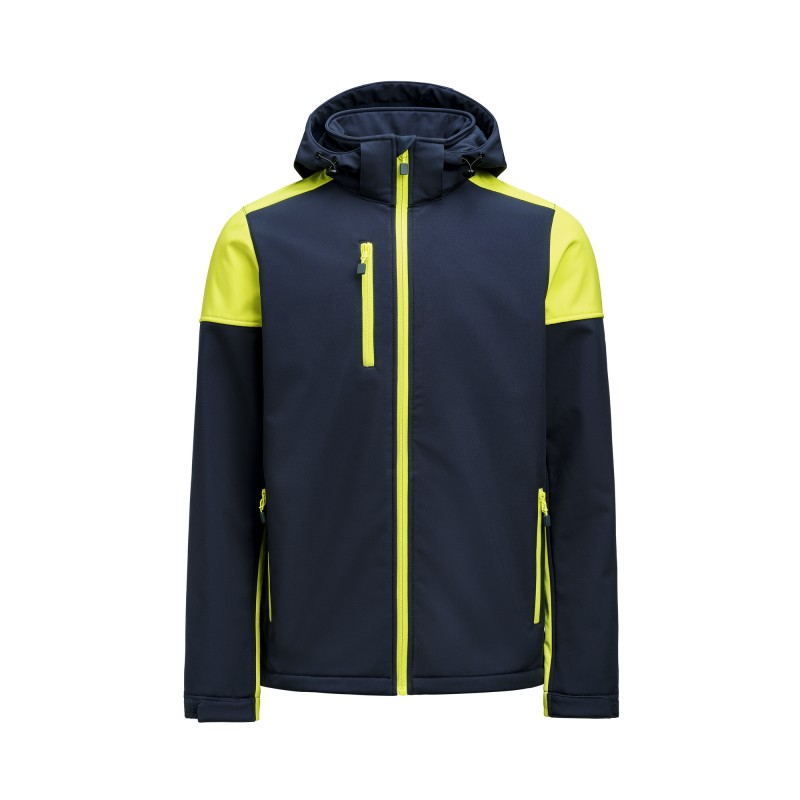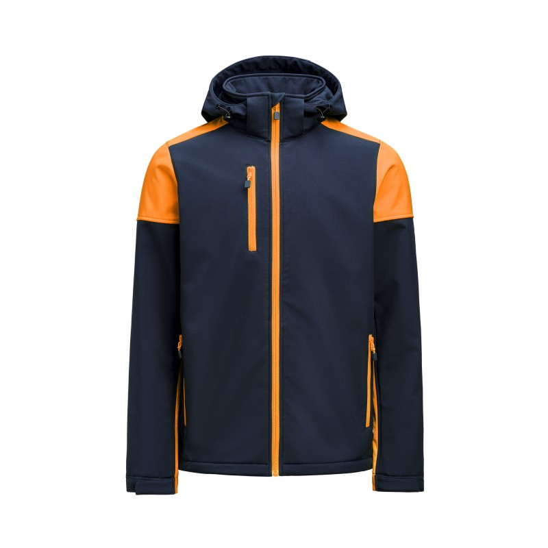 Chaqueta softshell bicolor con capucha desmontable. Cremallera a contraste frontal y en bolsillos delanteros. Tiras de velcro ajustables en puños y cordón elástico en capucha y cintura. Etiqueta en cuello fácil de quitar y etiqueta con talla por separado. Tiradores de cremallera a contraste. Los tiradores de cremallera de repuesto se venden por separado. Certificado Oeko-Tex 100.