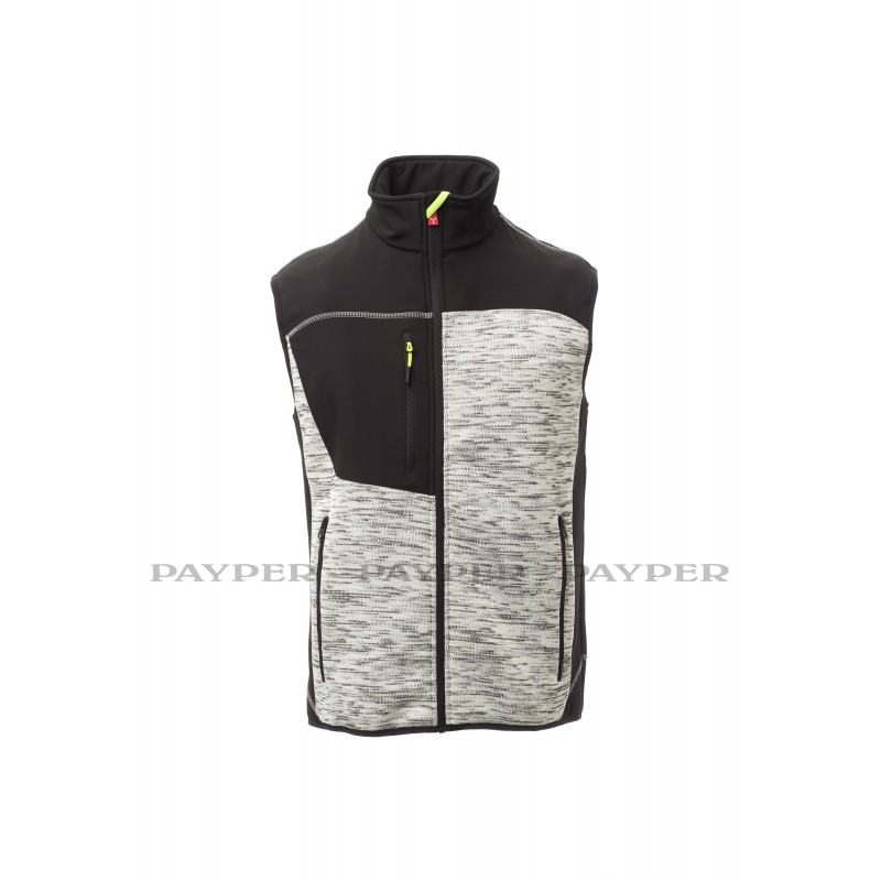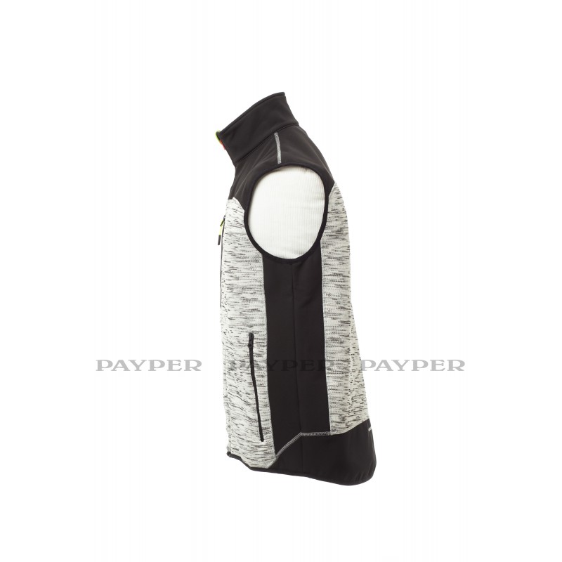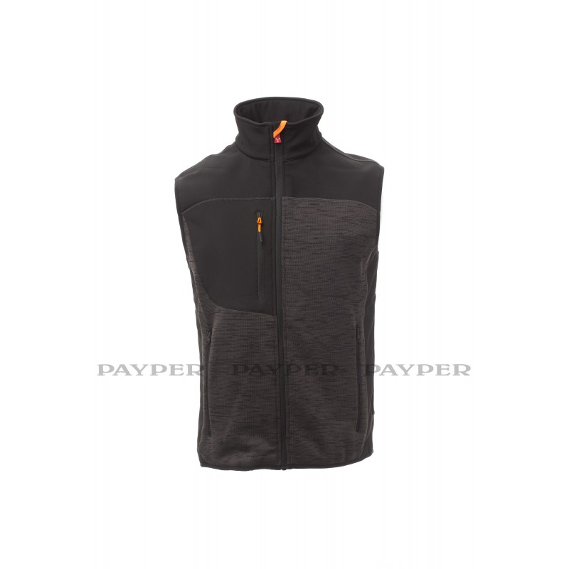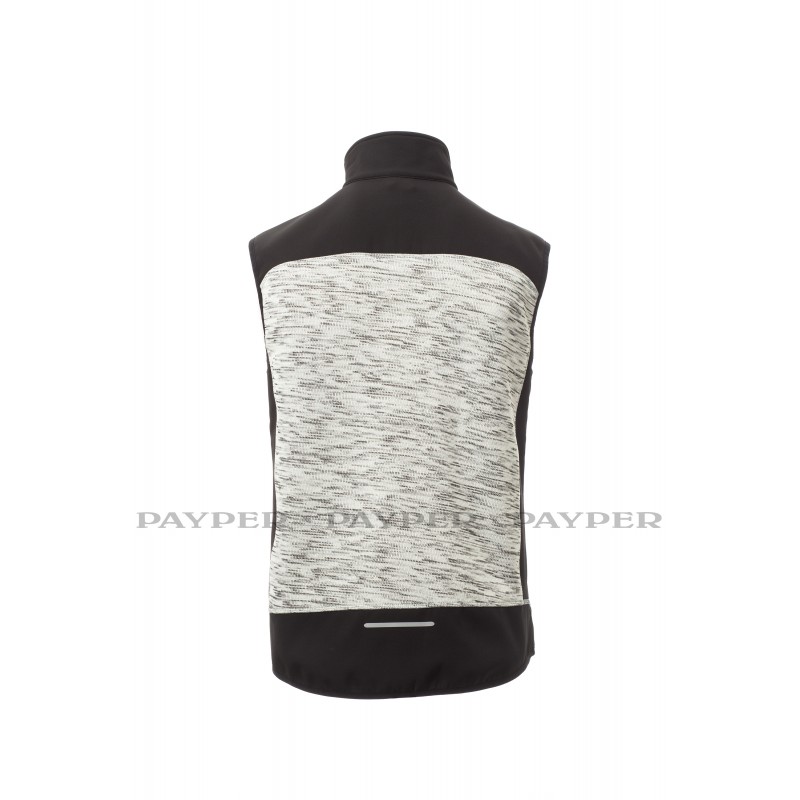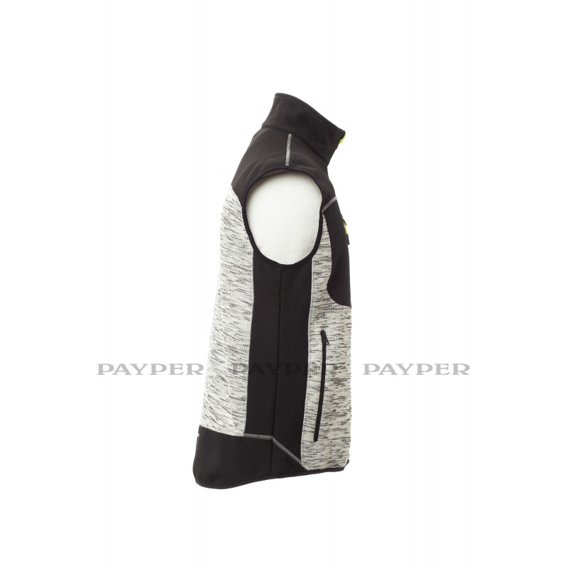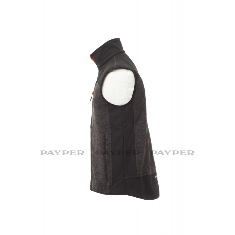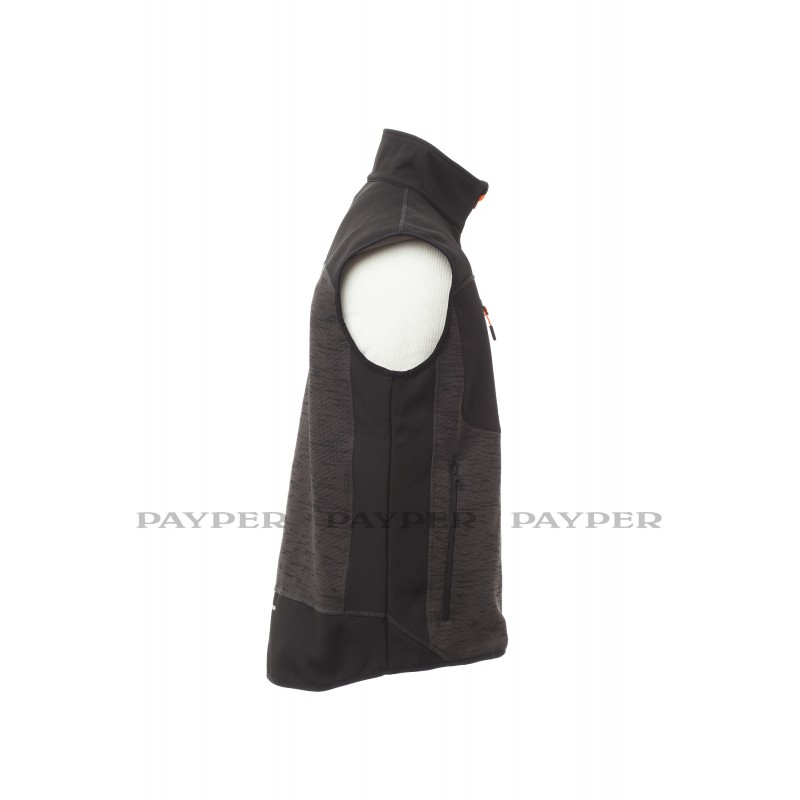 Chaleco de punto técnico con inserciones en soft-shell negro, bicolor, cierre con cremallera con cursor de metal con sistema de bloqueo semiautomático y tirador personalizado. Ribete fino en la sisa y la cintura, dos bolsillos laterales con cremallera, un bolsillo en el pecho.