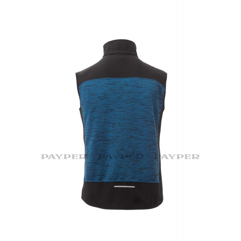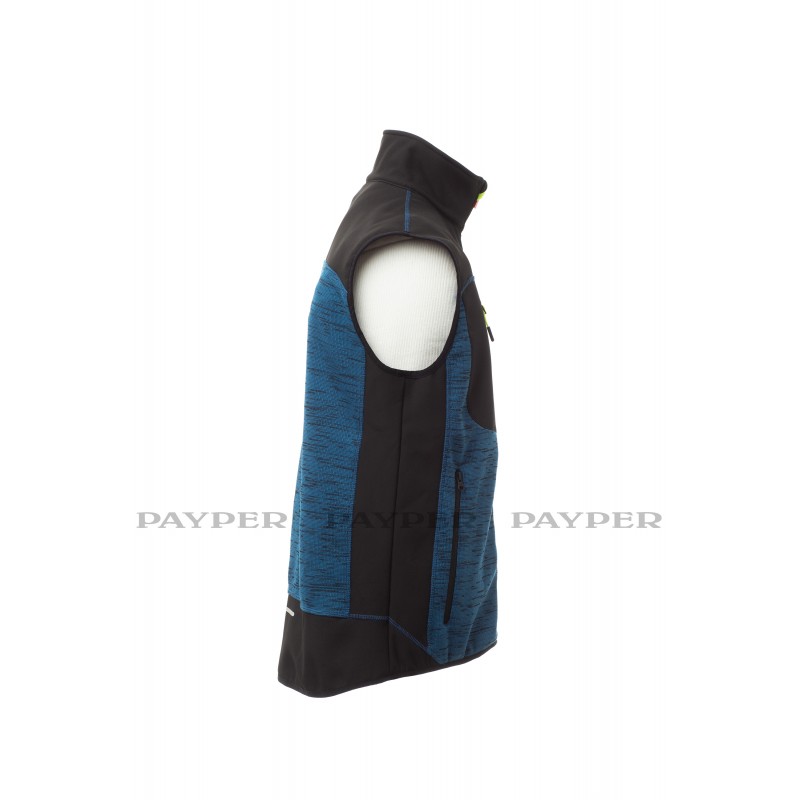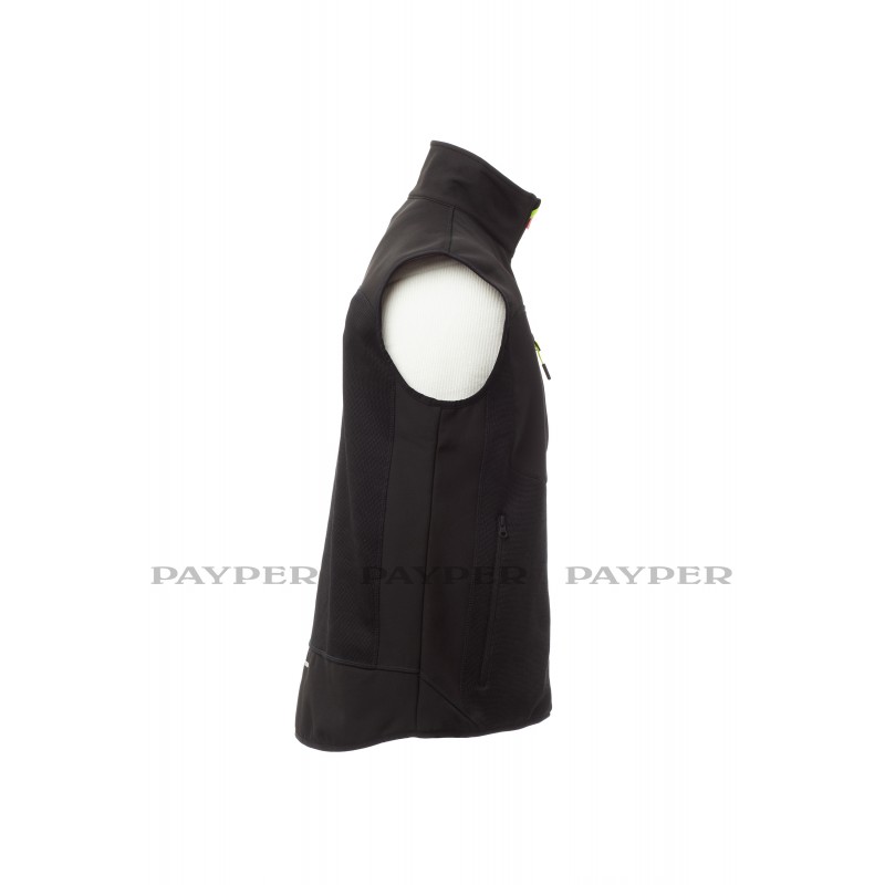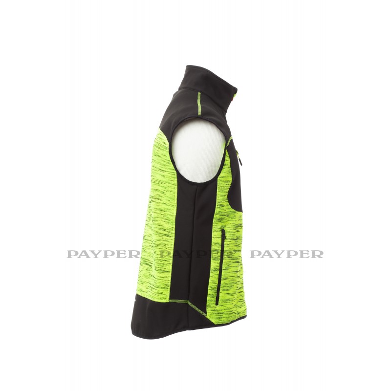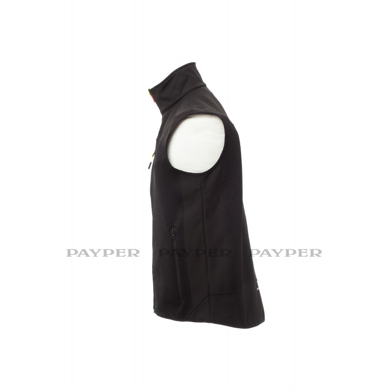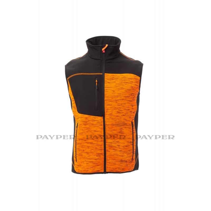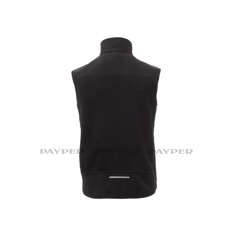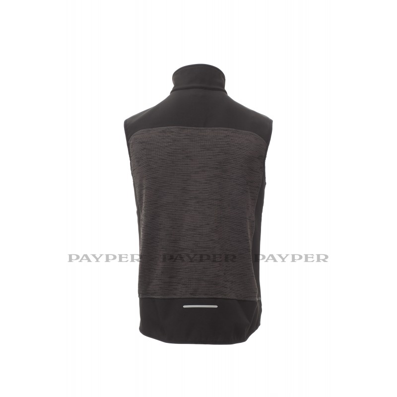 Chaleco de punto técnico con inserciones en soft-shell negro, bicolor, cierre con cremallera con cursor de metal con sistema de bloqueo semiautomático y tirador personalizado. Ribete fino en la sisa y la cintura, dos bolsillos laterales con cremallera, un bolsillo en el pecho.