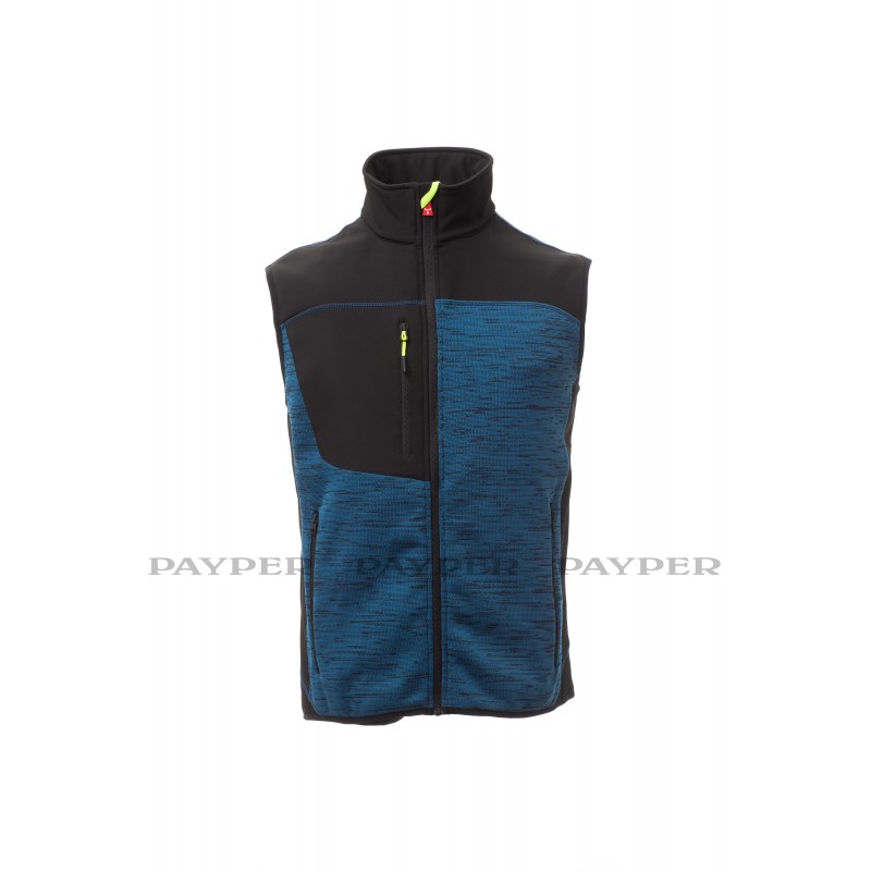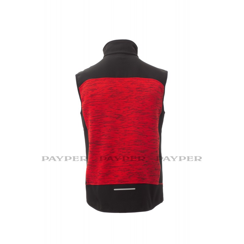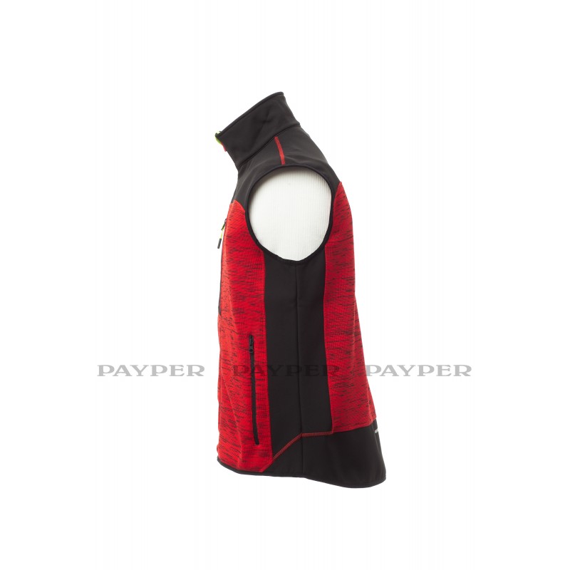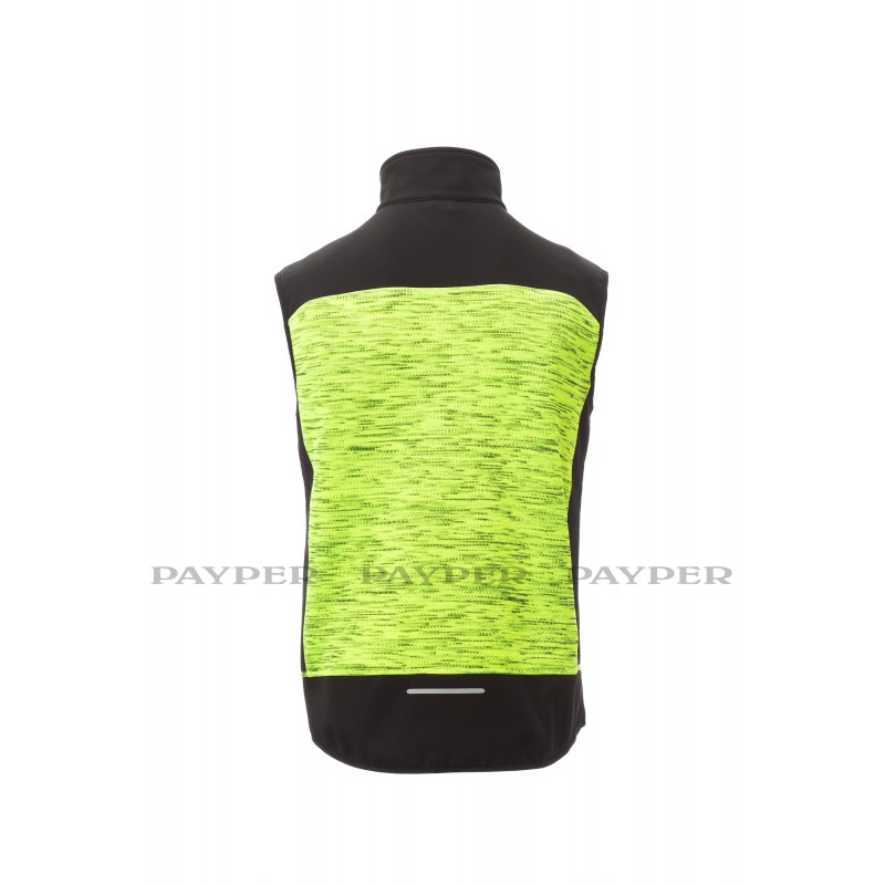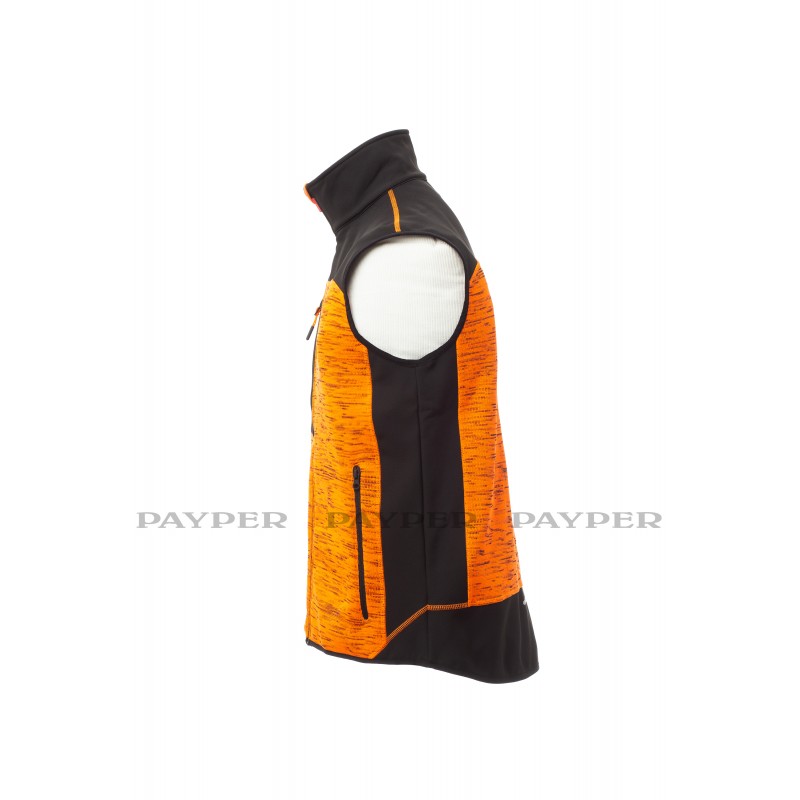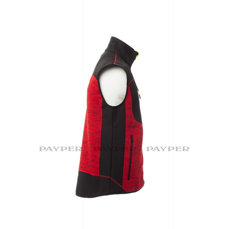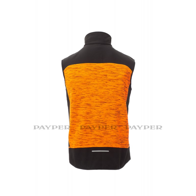 Chaleco de punto técnico con inserciones en soft-shell negro, bicolor, cierre con cremallera con cursor de metal con sistema de bloqueo semiautomático y tirador personalizado. Ribete fino en la sisa y la cintura, dos bolsillos laterales con cremallera, un bolsillo en el pecho.