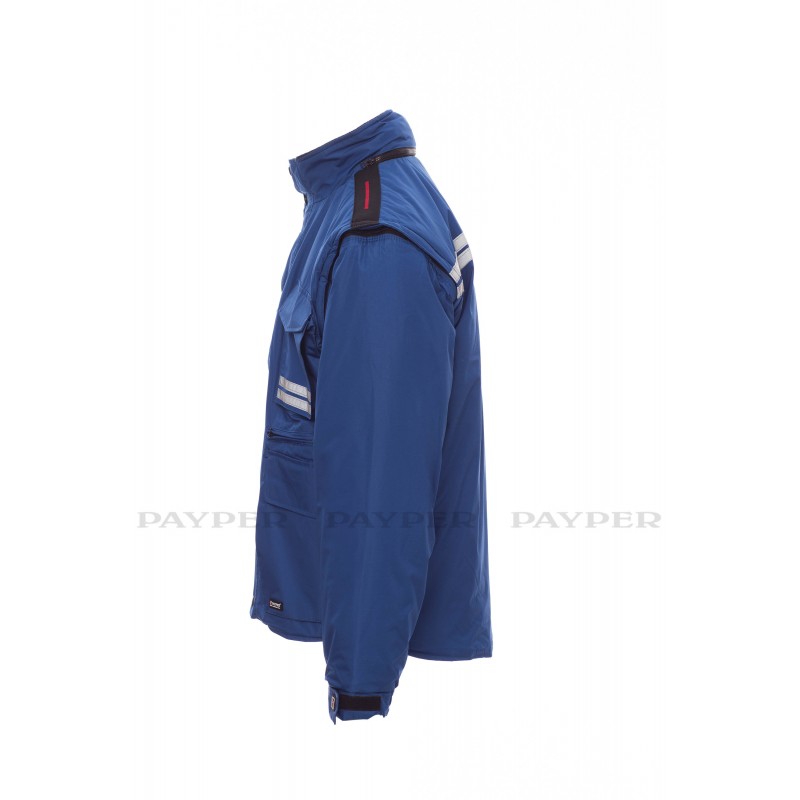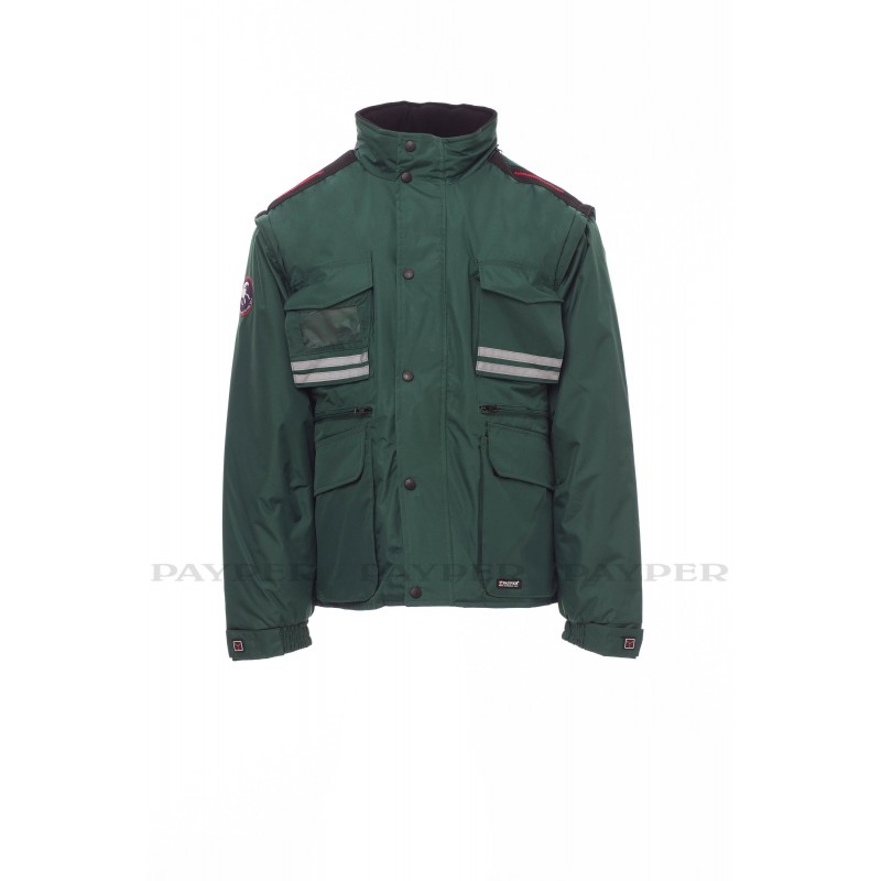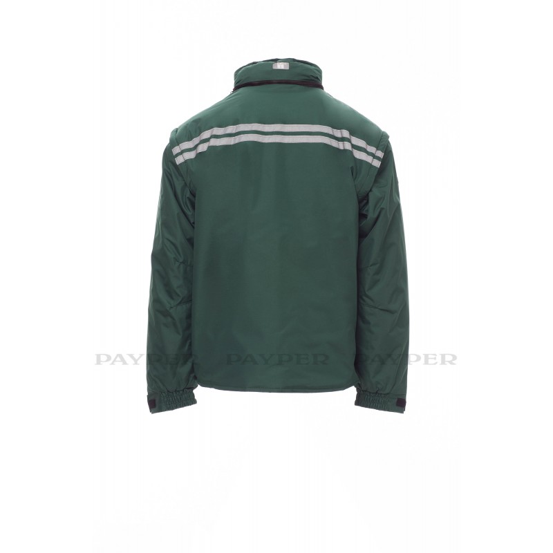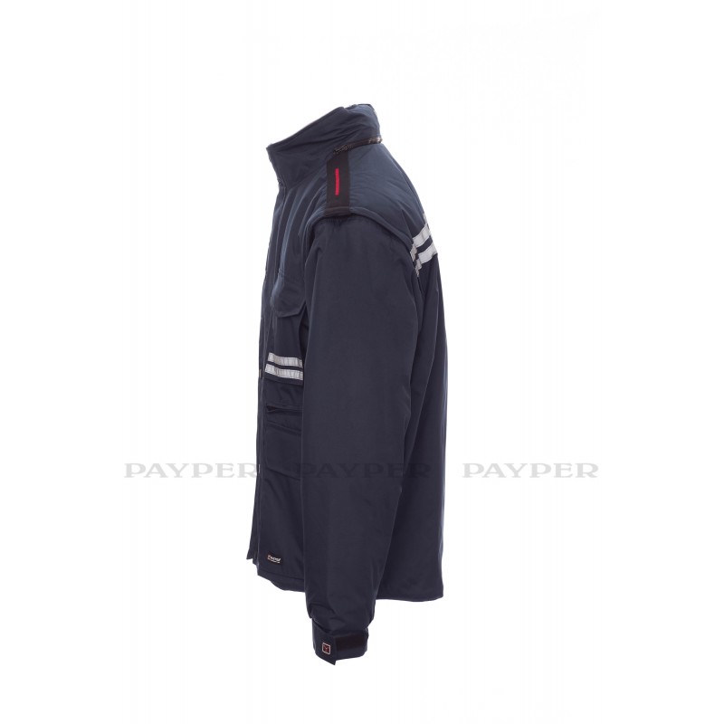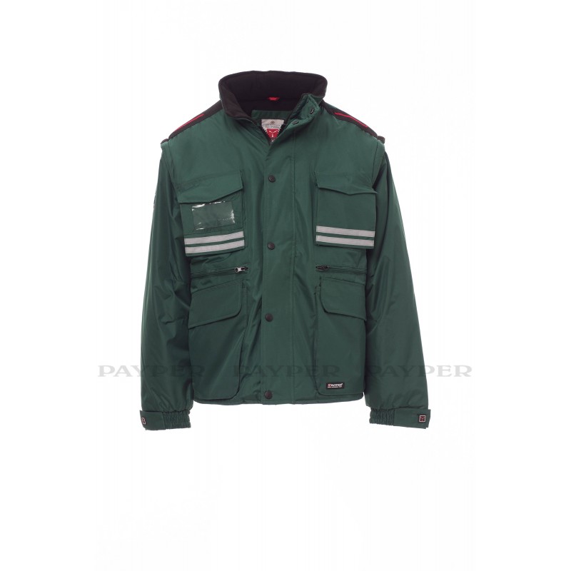 Chaqueta para hombre, mangas extraíbles, cremallera de plástico de 8 mm con cursor metálico, con tapeta y botones de plástico, capucha extraíble o plegable en el cuello, puños ajustables, bandas reflectantes de color gris en la parte delantera y trasera, codos preformados, abertura lateral con fuelle y cremallera, nueve bolsillos exteriores, dos con LOCK SYSTEM, dos con cremallera y parte interior reforzada, uno con soporte plegable para tarjeta de identificación reversible. Interior: acolchado, calentador de micro forro polar en la parte interior del cuello, espalda y zona lumbar, aplicaciones transpirables debajo del brazo, cordón y cremallera interior para facilitar la impresión y el bordado.