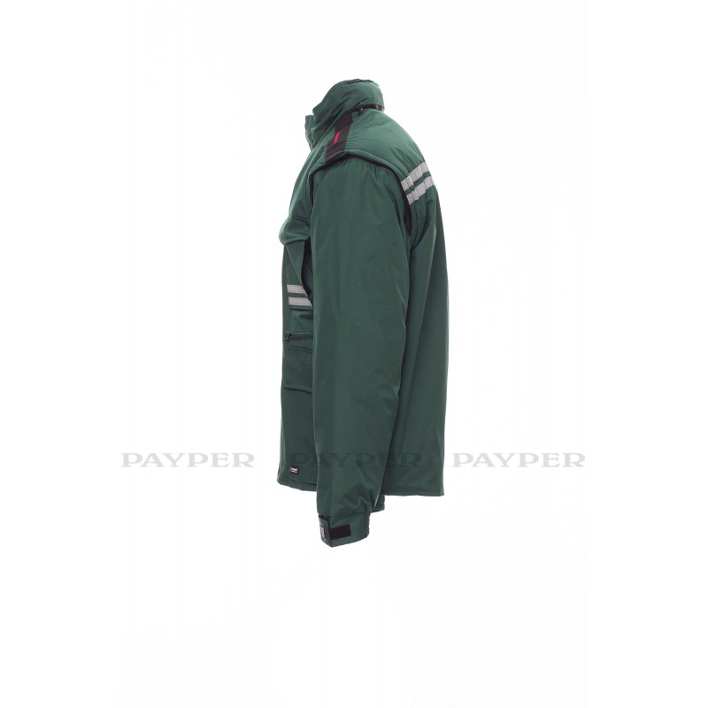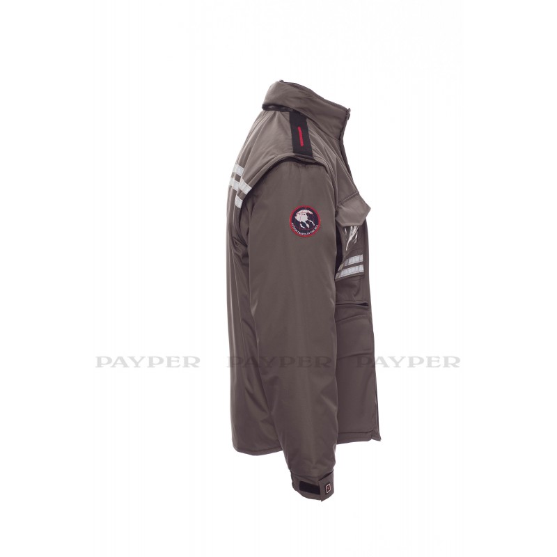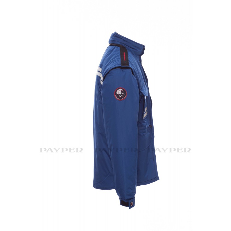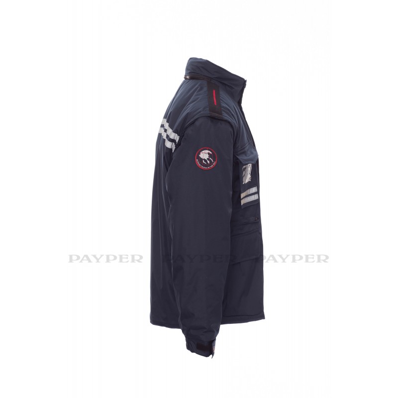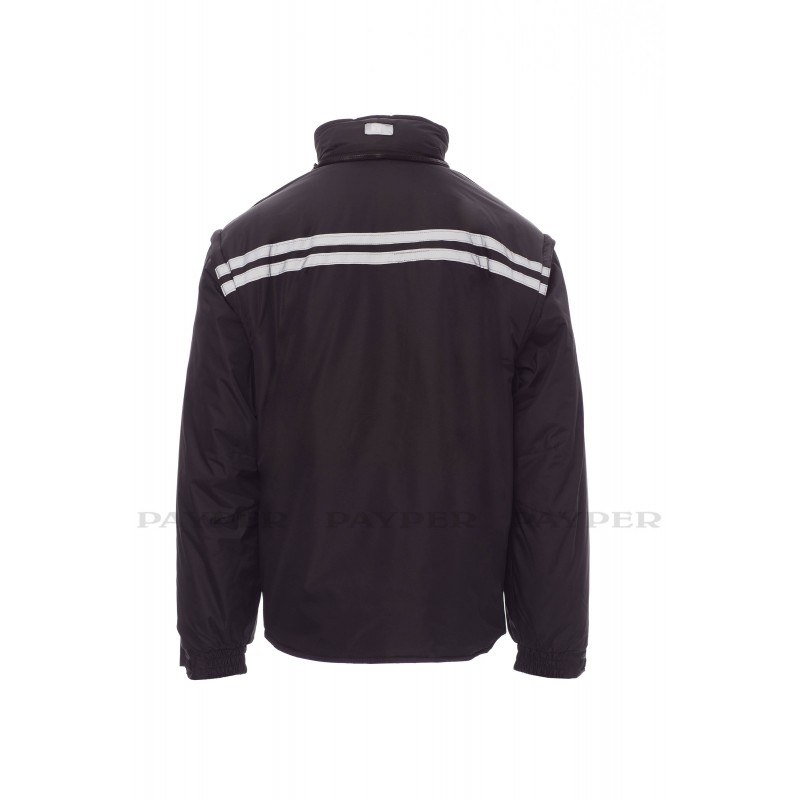 Chaqueta para hombre, mangas extraíbles, cremallera de plástico de 8 mm con cursor metálico, con tapeta y botones de plástico, capucha extraíble o plegable en el cuello, puños ajustables, bandas reflectantes de color gris en la parte delantera y trasera, codos preformados, abertura lateral con fuelle y cremallera, nueve bolsillos exteriores, dos con LOCK SYSTEM, dos con cremallera y parte interior reforzada, uno con soporte plegable para tarjeta de identificación reversible. Interior: acolchado, calentador de micro forro polar en la parte interior del cuello, espalda y zona lumbar, aplicaciones transpirables debajo del brazo, cordón y cremallera interior para facilitar la impresión y el bordado.