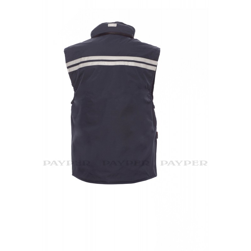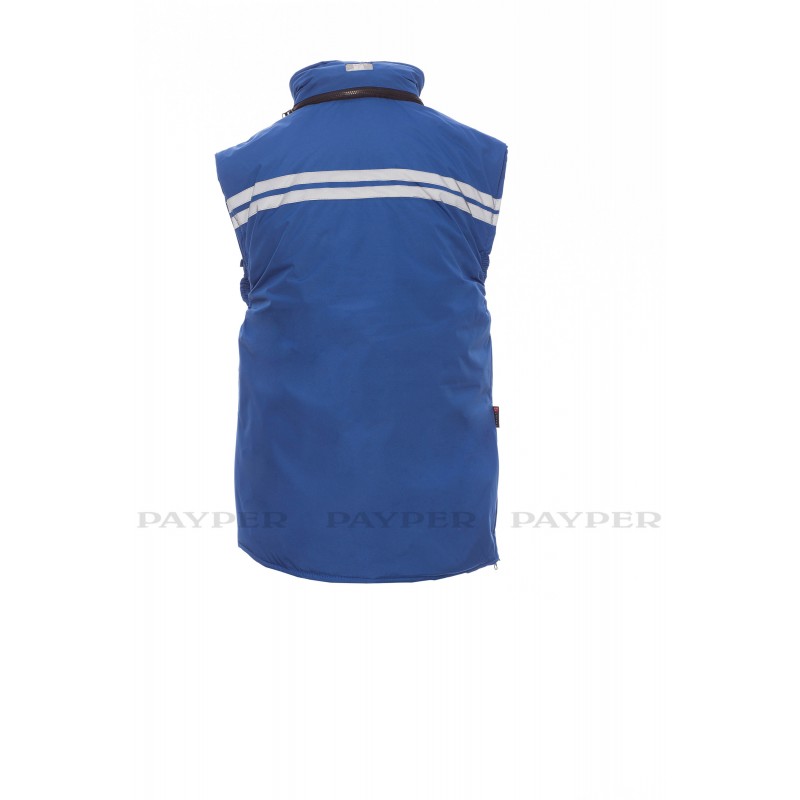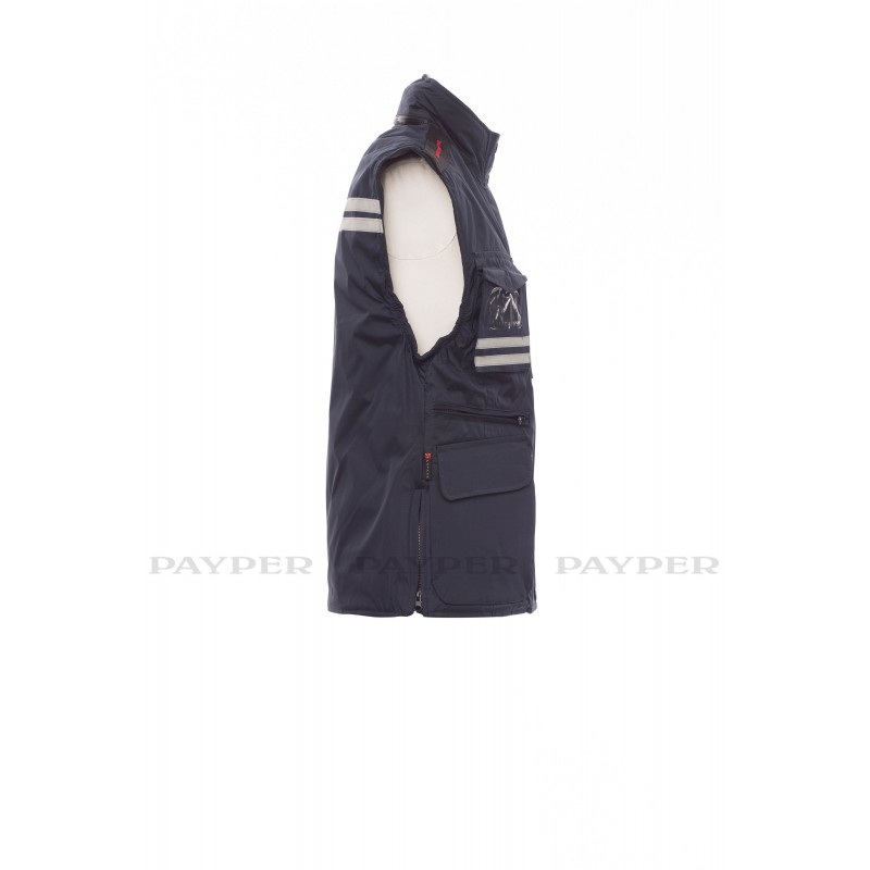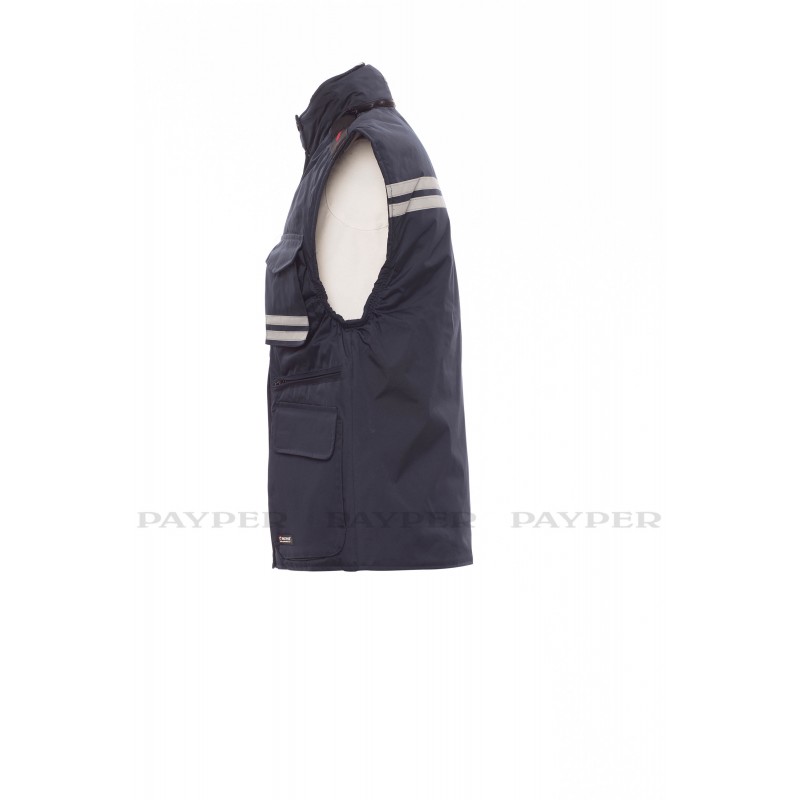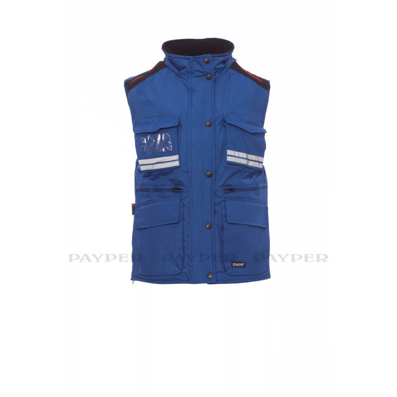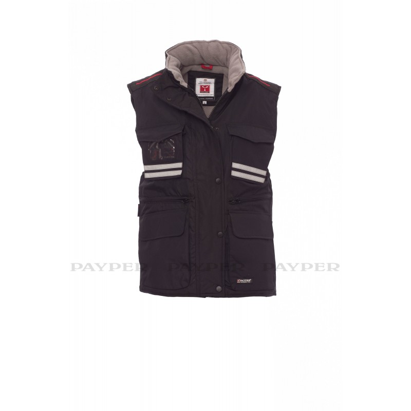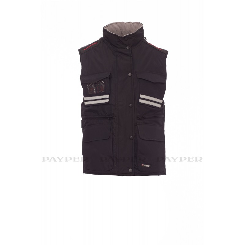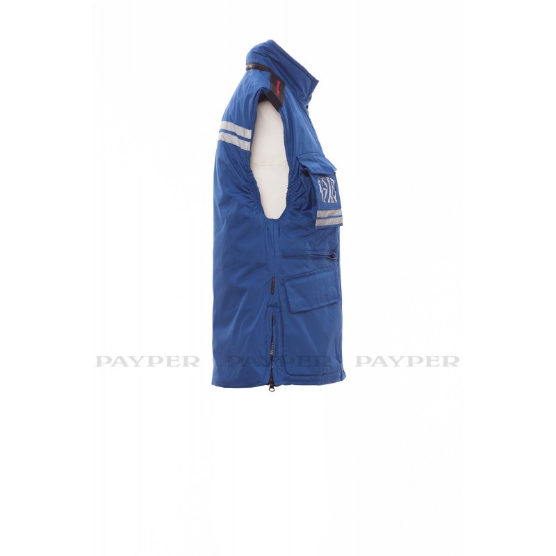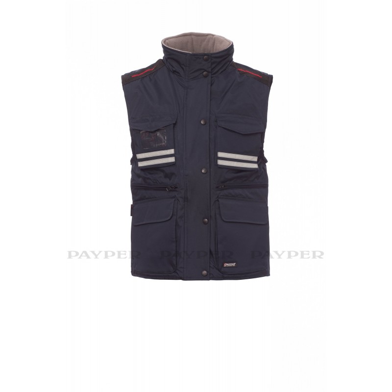 Chaleco ergonómico para mujer, cremallera de plástico de 8 mm con cursor metálico, con tapeta y botones de plástico, capucha extraíble o plegable en el cuello, bandas reflectantes de color gris en la parte delantera y trasera, corte lateral con fuelle y cremallera, nueve bolsillos exteriores, dos con LOCK SYSTEM, dos con cremallera y parte interior reforzada, uno con soporte plegable para tarjeta de identificación reversible. Interior: acolchado, calentador de micro forro polar en la parte interior del cuello, espalda y zona lumbar, cordón y cremallera interior para facilitar la impresión y el bordado.