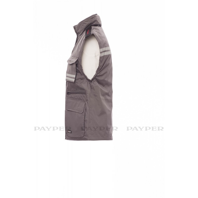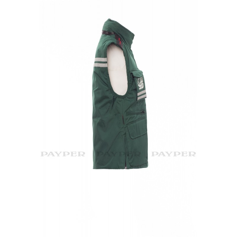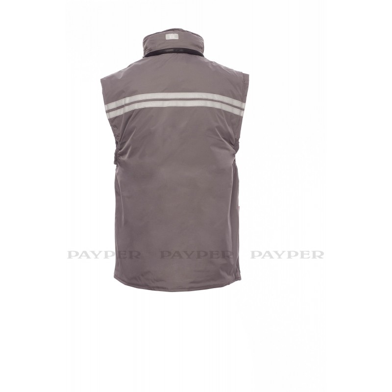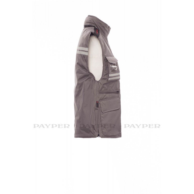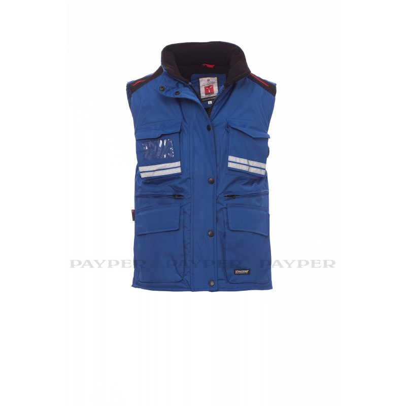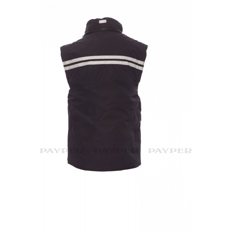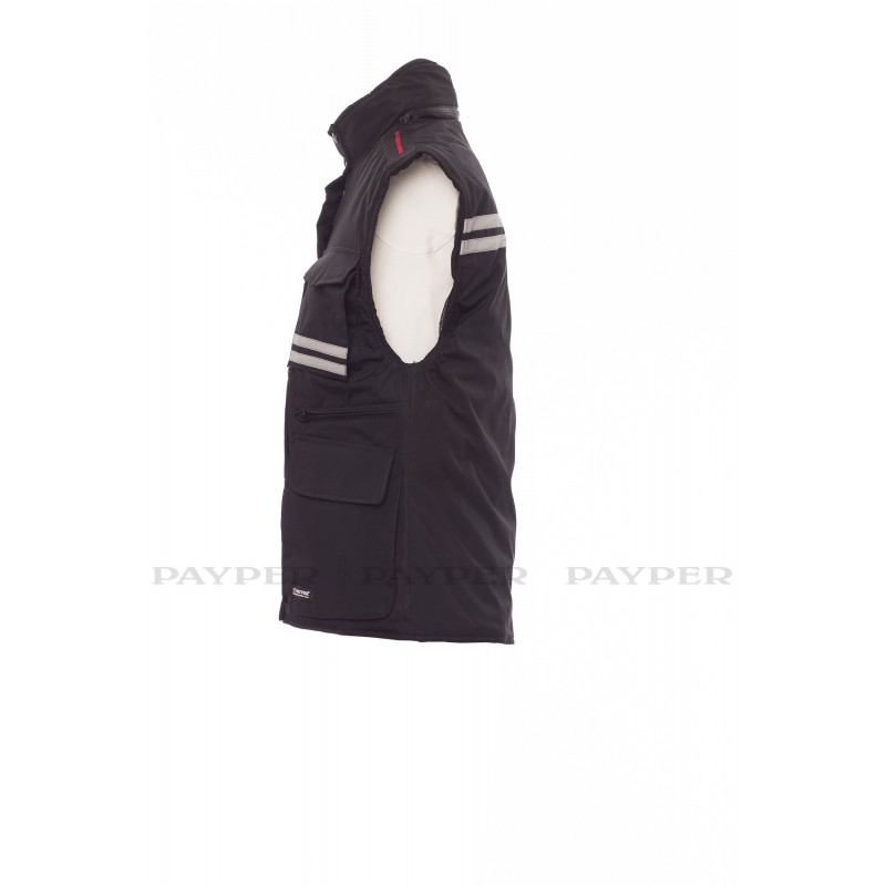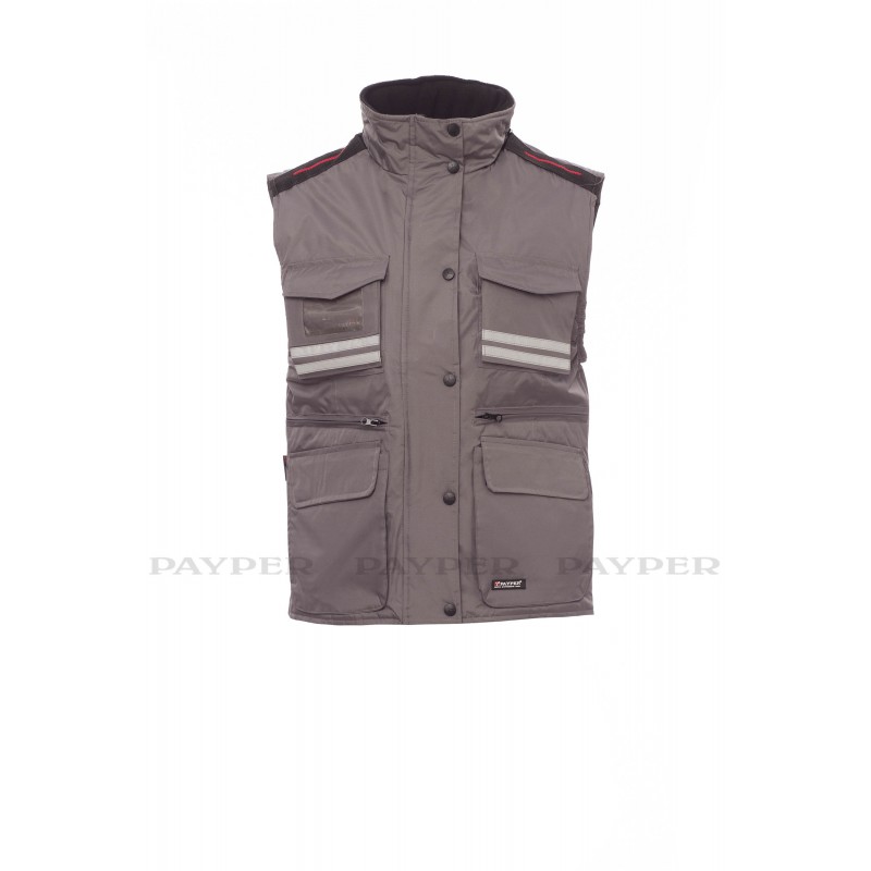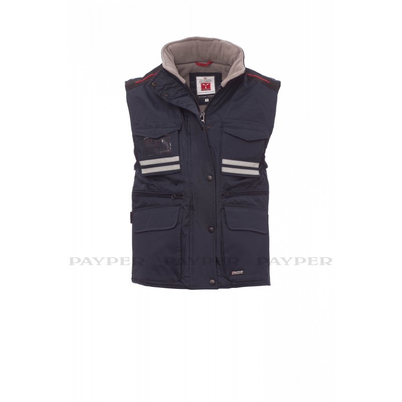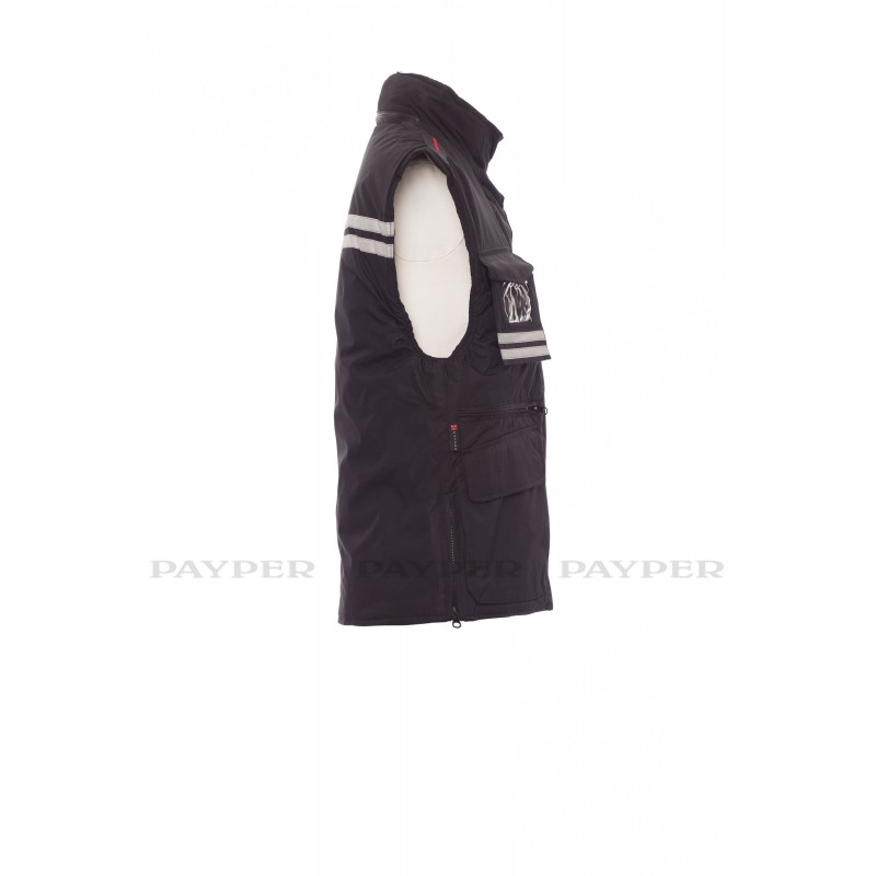 Chaleco ergonómico para mujer, cremallera de plástico de 8 mm con cursor metálico, con tapeta y botones de plástico, capucha extraíble o plegable en el cuello, bandas reflectantes de color gris en la parte delantera y trasera, corte lateral con fuelle y cremallera, nueve bolsillos exteriores, dos con LOCK SYSTEM, dos con cremallera y parte interior reforzada, uno con soporte plegable para tarjeta de identificación reversible. Interior: acolchado, calentador de micro forro polar en la parte interior del cuello, espalda y zona lumbar, cordón y cremallera interior para facilitar la impresión y el bordado.