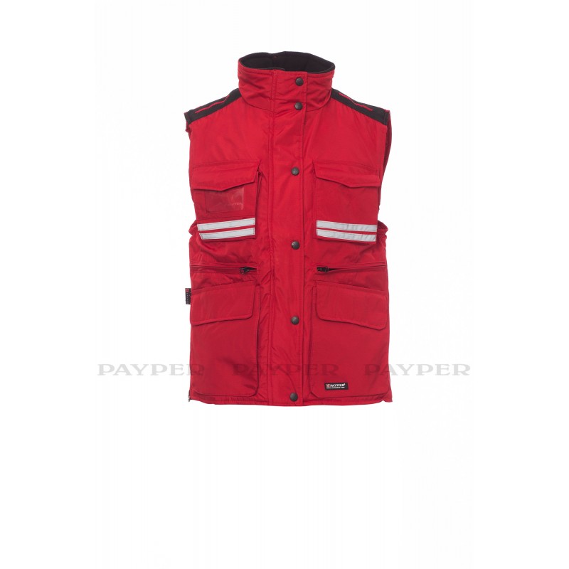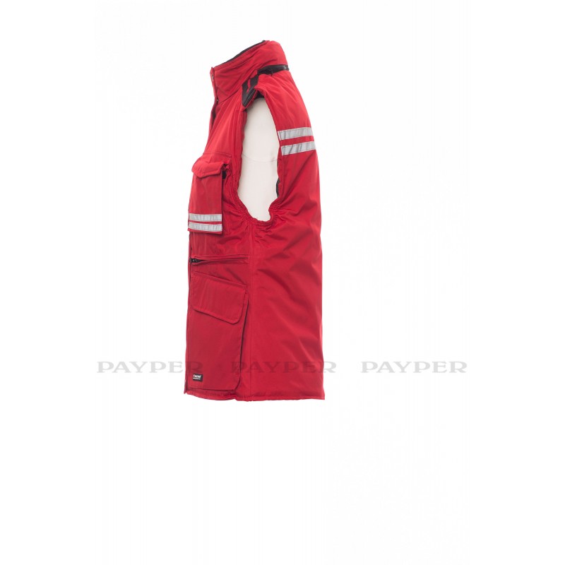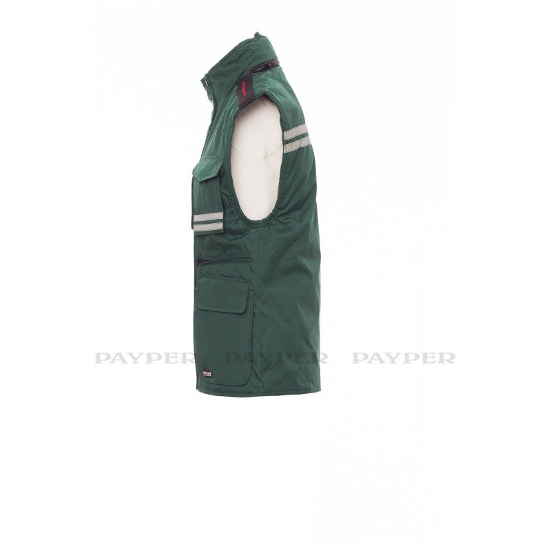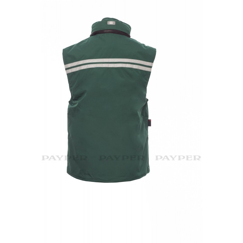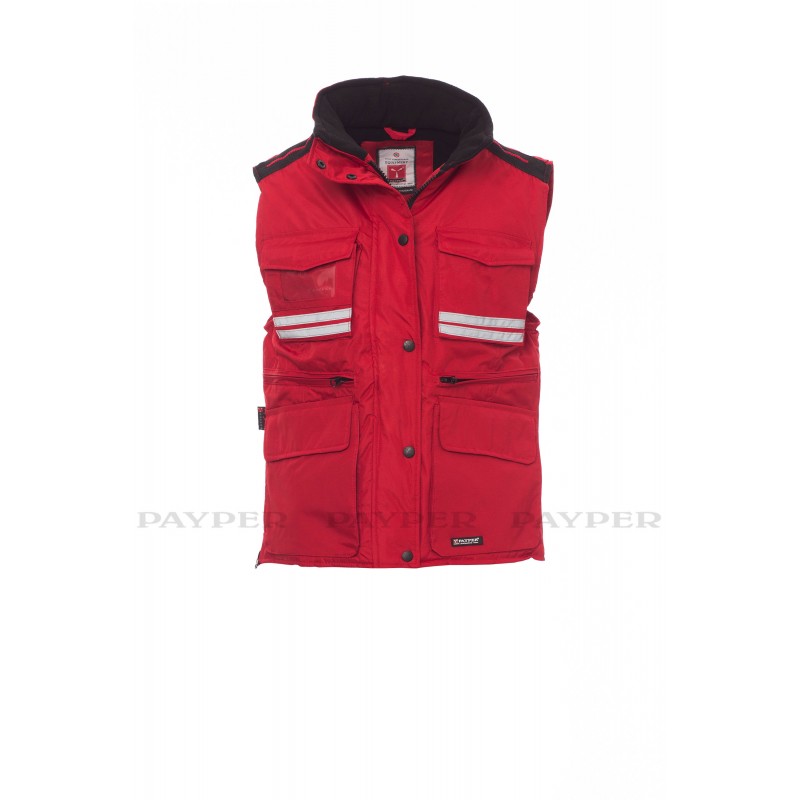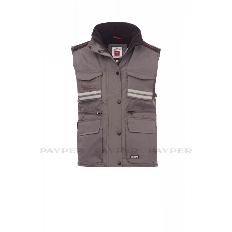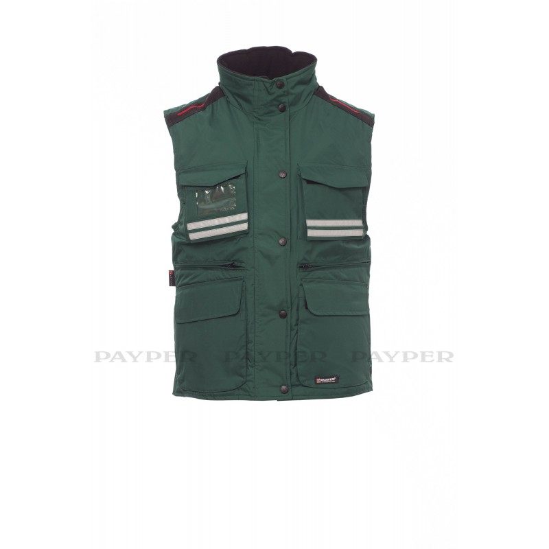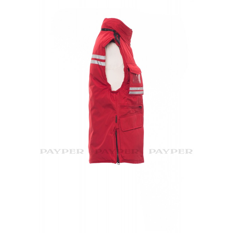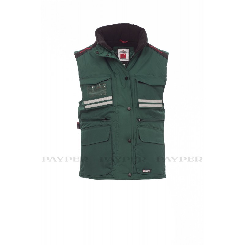 Chaleco ergonómico para mujer, cremallera de plástico de 8 mm con cursor metálico, con tapeta y botones de plástico, capucha extraíble o plegable en el cuello, bandas reflectantes de color gris en la parte delantera y trasera, corte lateral con fuelle y cremallera, nueve bolsillos exteriores, dos con LOCK SYSTEM, dos con cremallera y parte interior reforzada, uno con soporte plegable para tarjeta de identificación reversible. Interior: acolchado, calentador de micro forro polar en la parte interior del cuello, espalda y zona lumbar, cordón y cremallera interior para facilitar la impresión y el bordado.