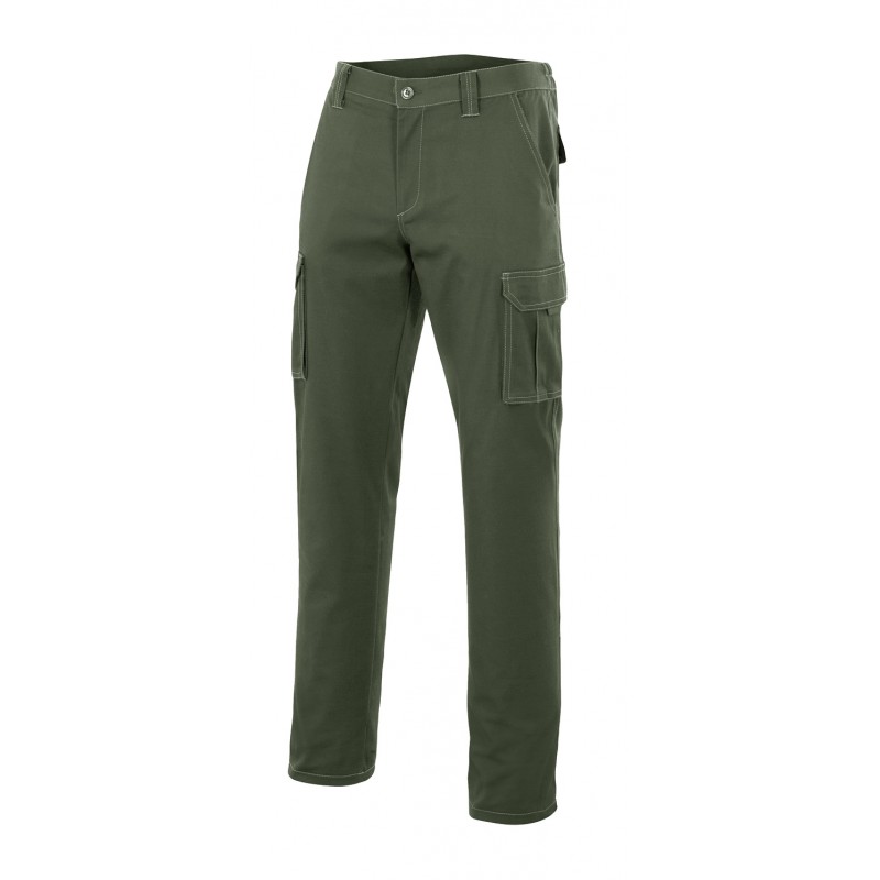 Con goma elástica en el interior de la cinturilla de la espalda. Dos bolsillos franceses y cuatro con tapeta y velcro. Pespunte trasero de seguridad.