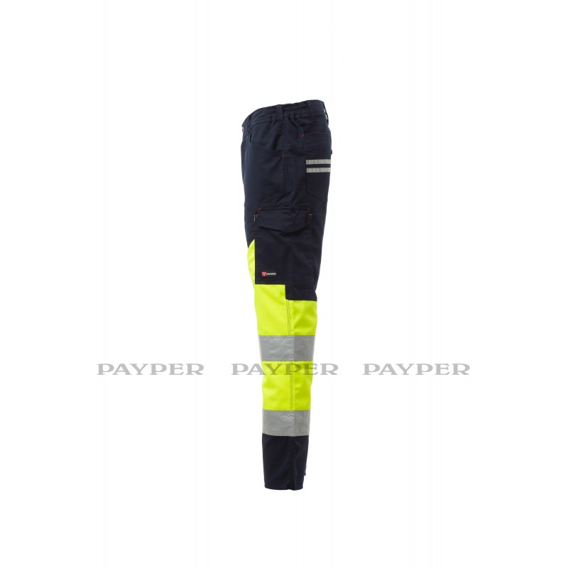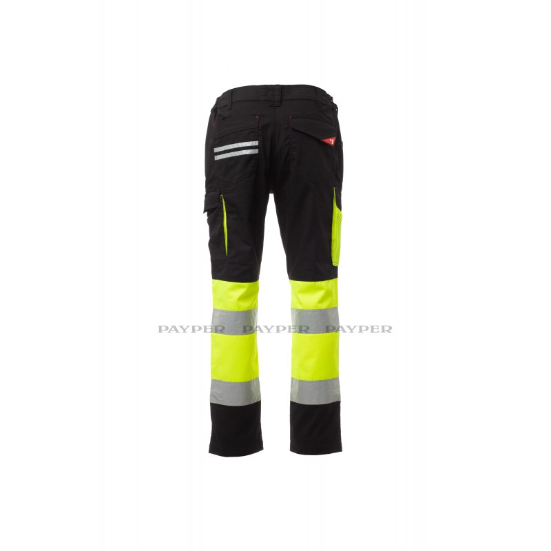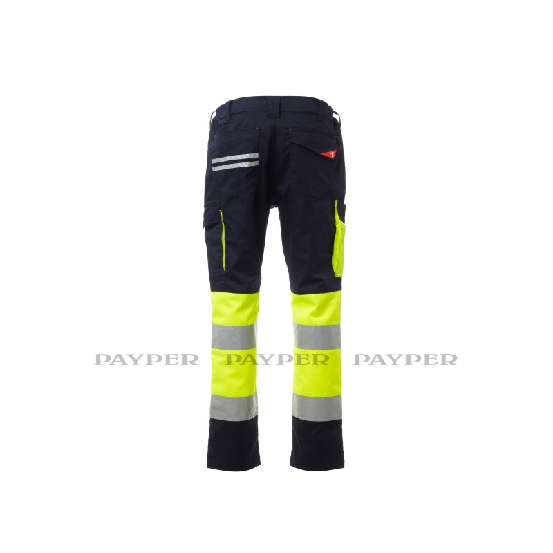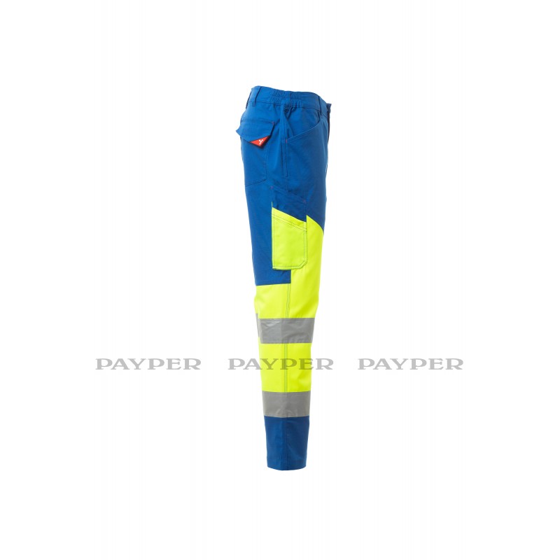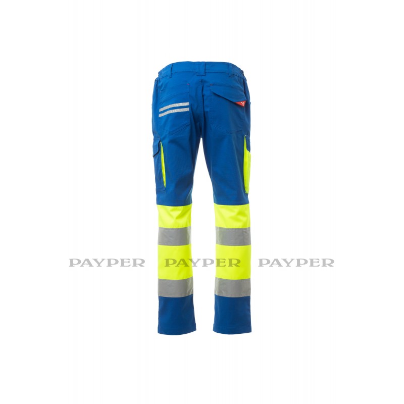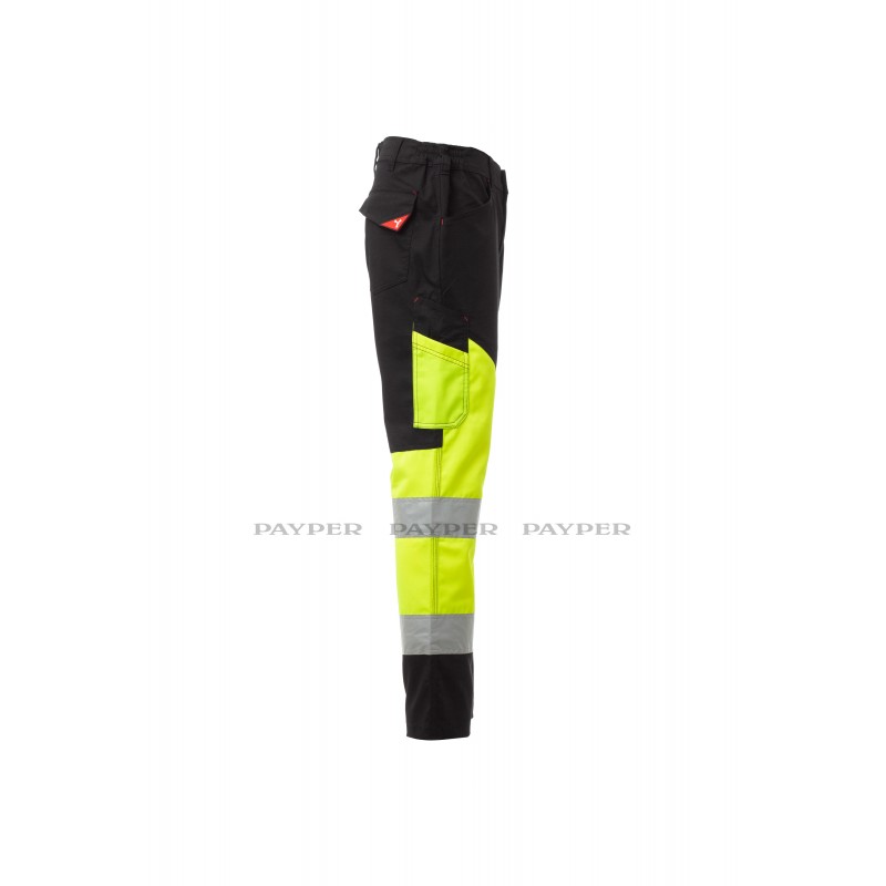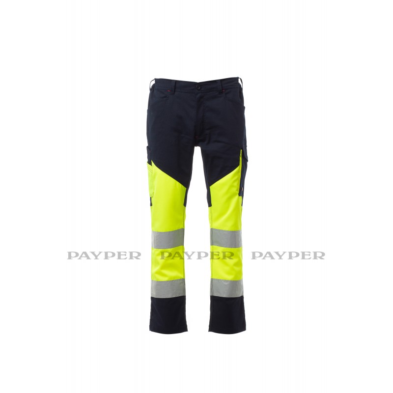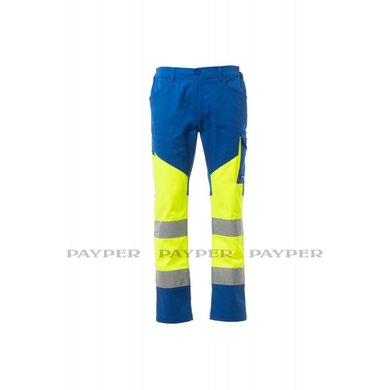Pantalón de verano unisex, bicolor, de alta visibilidad, bandas reflectantes, elásticos laterales y trabillas en la cintura. Cierre con cremallera y botón de plástico, dos bolsillos delanteros contorneados, uno lateral con cierre LOCK SYSTEM y con soporte para tarjeta de identificación extraíble y otro con soporte doble para metro.