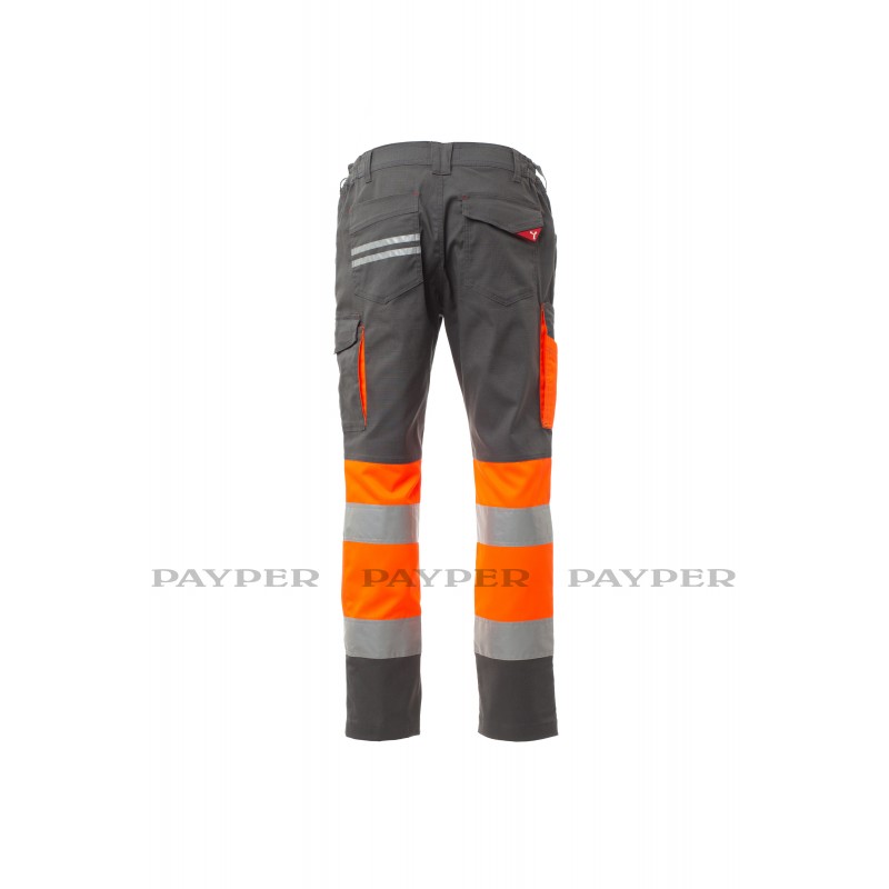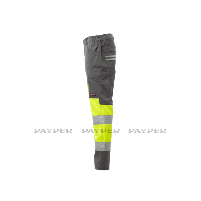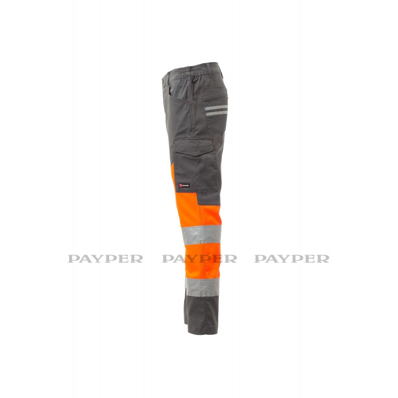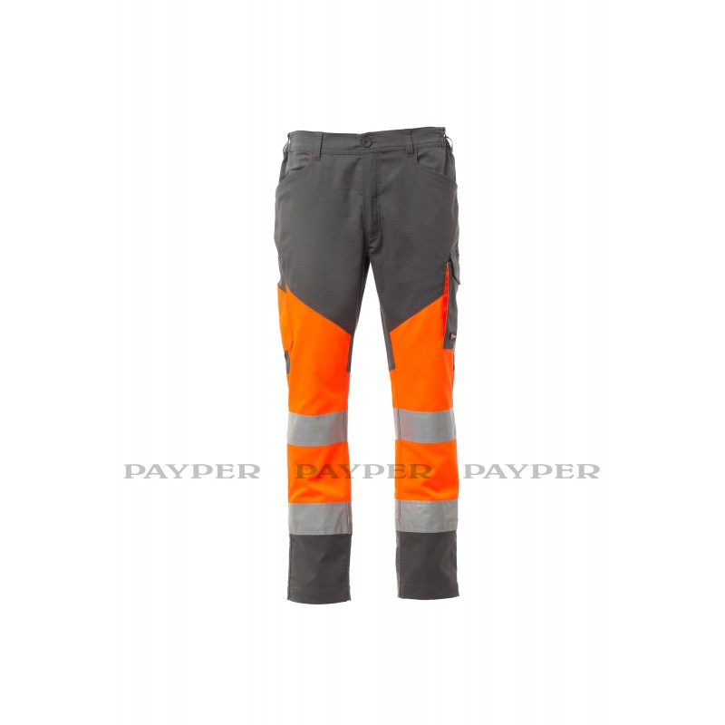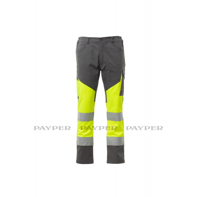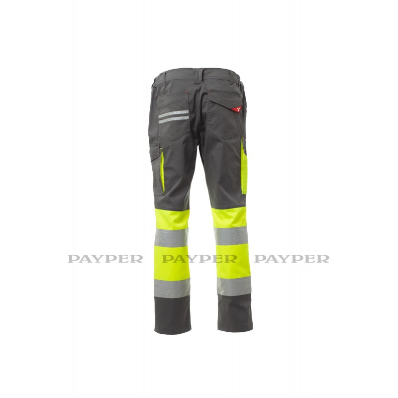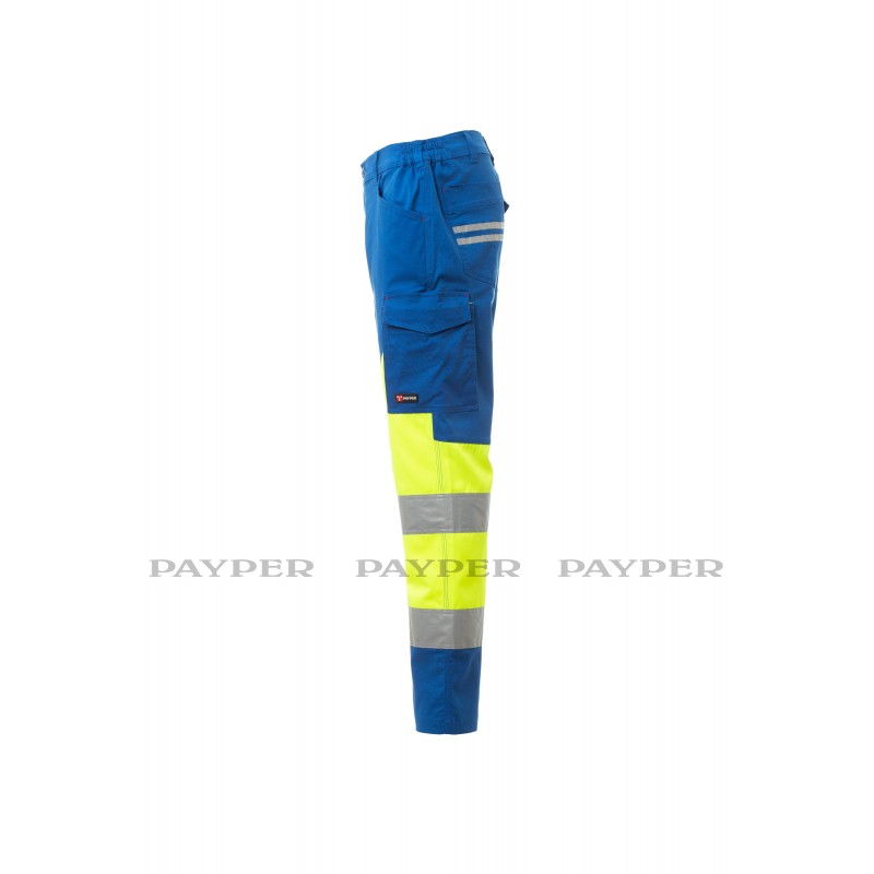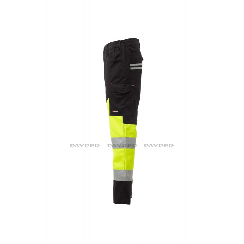 Pantalón de verano unisex, bicolor, de alta visibilidad, bandas reflectantes, elásticos laterales y trabillas en la cintura. Cierre con cremallera y botón de plástico, dos bolsillos delanteros contorneados, uno lateral con cierre LOCK SYSTEM y con soporte para tarjeta de identificación extraíble y otro con soporte doble para metro.