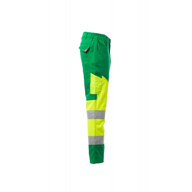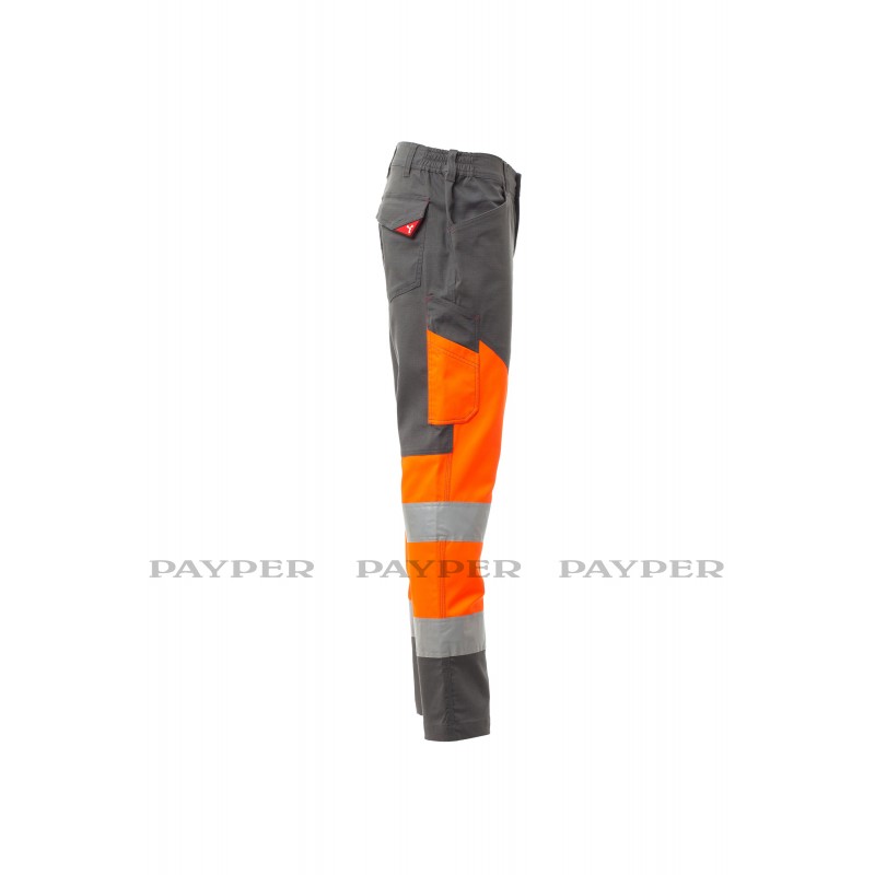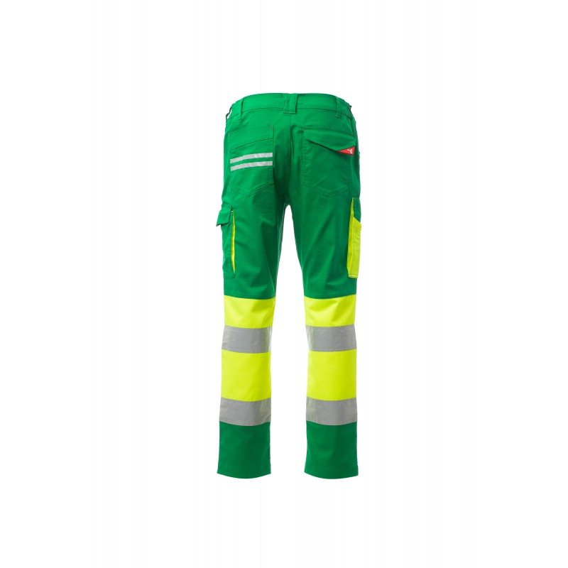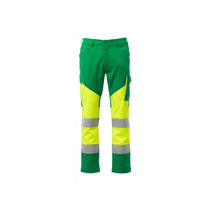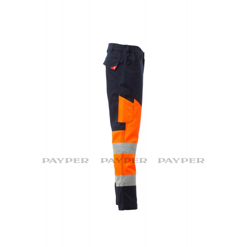 Pantalón de verano unisex, bicolor, de alta visibilidad, bandas reflectantes, elásticos laterales y trabillas en la cintura. Cierre con cremallera y botón de plástico, dos bolsillos delanteros contorneados, uno lateral con cierre LOCK SYSTEM y con soporte para tarjeta de identificación extraíble y otro con soporte doble para metro. Dos bolsillos traseros: uno abierto con bandas reflectantes y otro con tapeta y velcro. Costuras a juego con el tejido en contraste. Entrepierna e interior de pierna con triple aguja. La talla internacional L tiene una entrepierna de 80 cm.