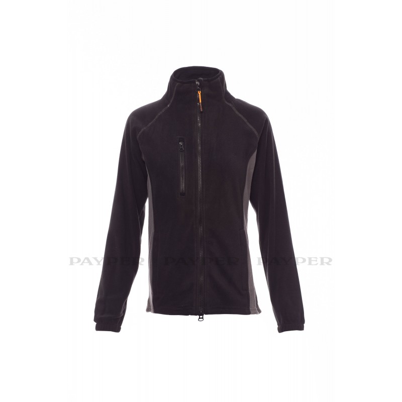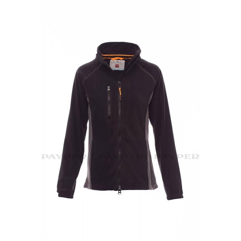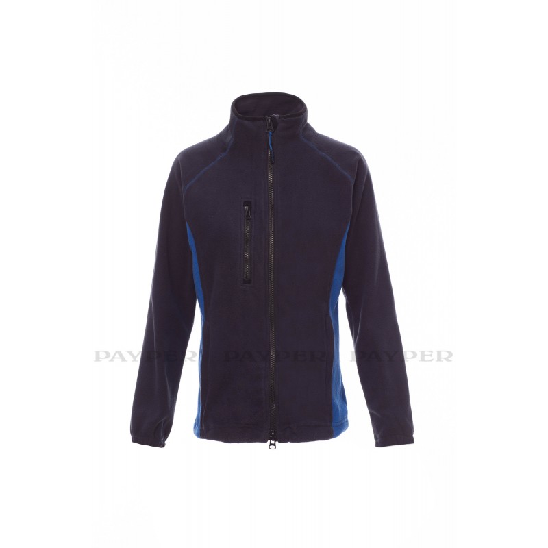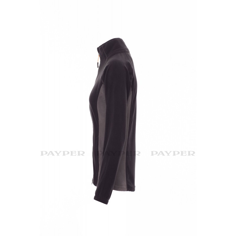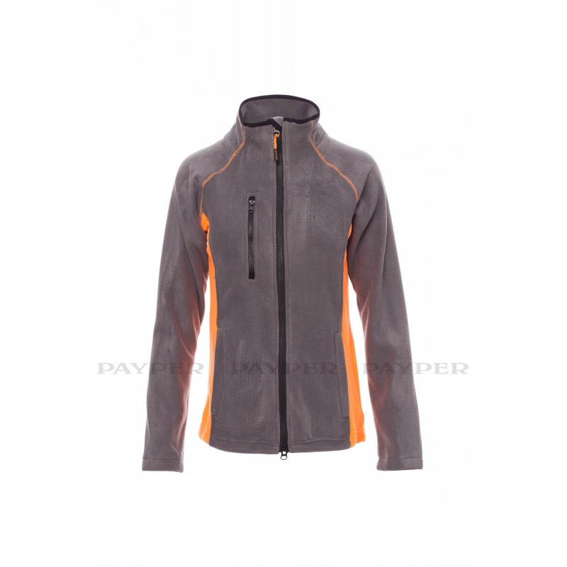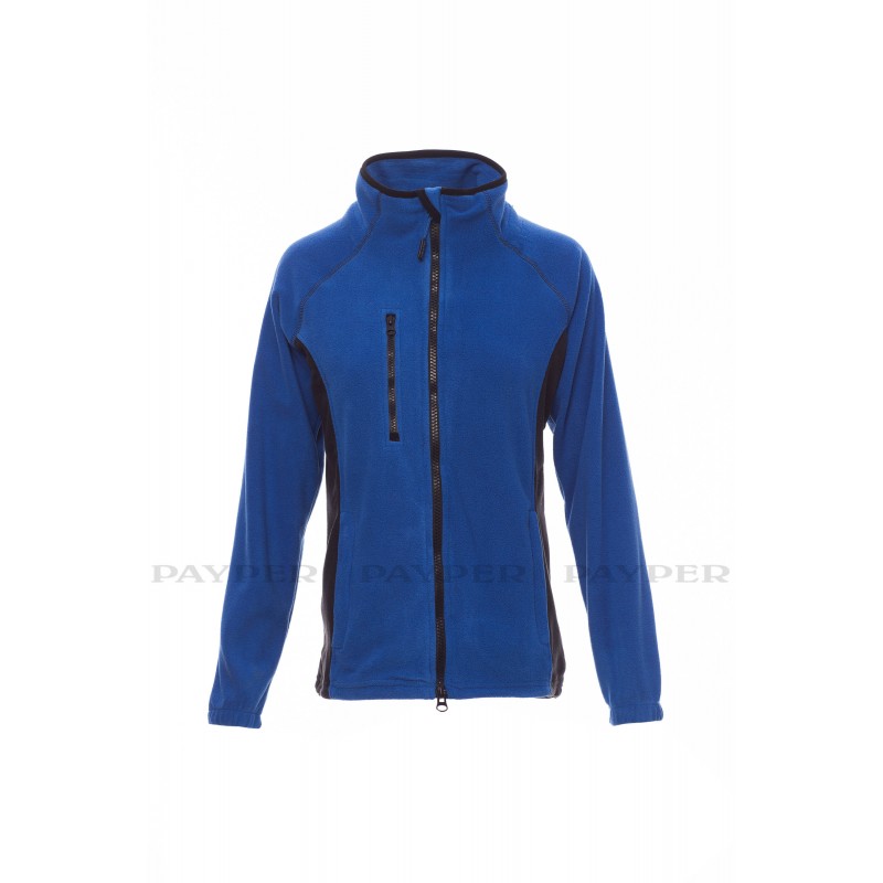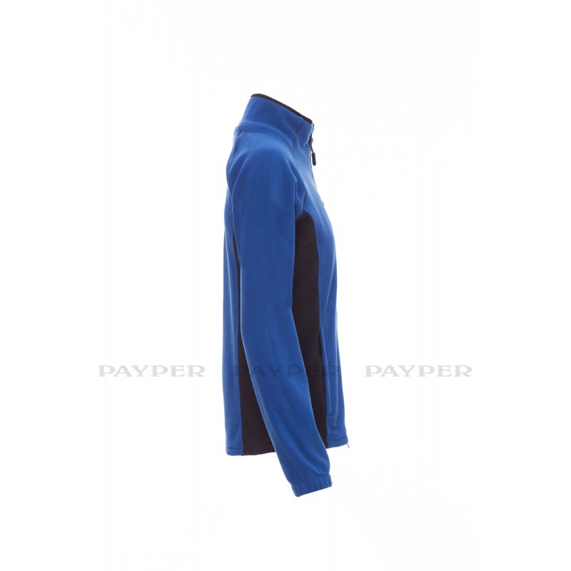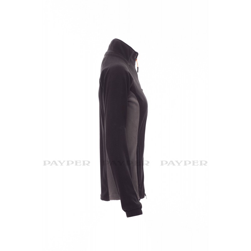 Forro polar ceñido en dos tonalidades para mujer, con cremallera de 8 mm de plástico negra, mangas ranglán, cordón ajustable en la cintura, puños elásticos, dos bolsillos con cremallera oculta, un bolsillo delantero con cremallera, cuello con cinta de refuerzo de contraste, costuras reforzadas.
