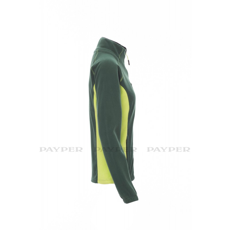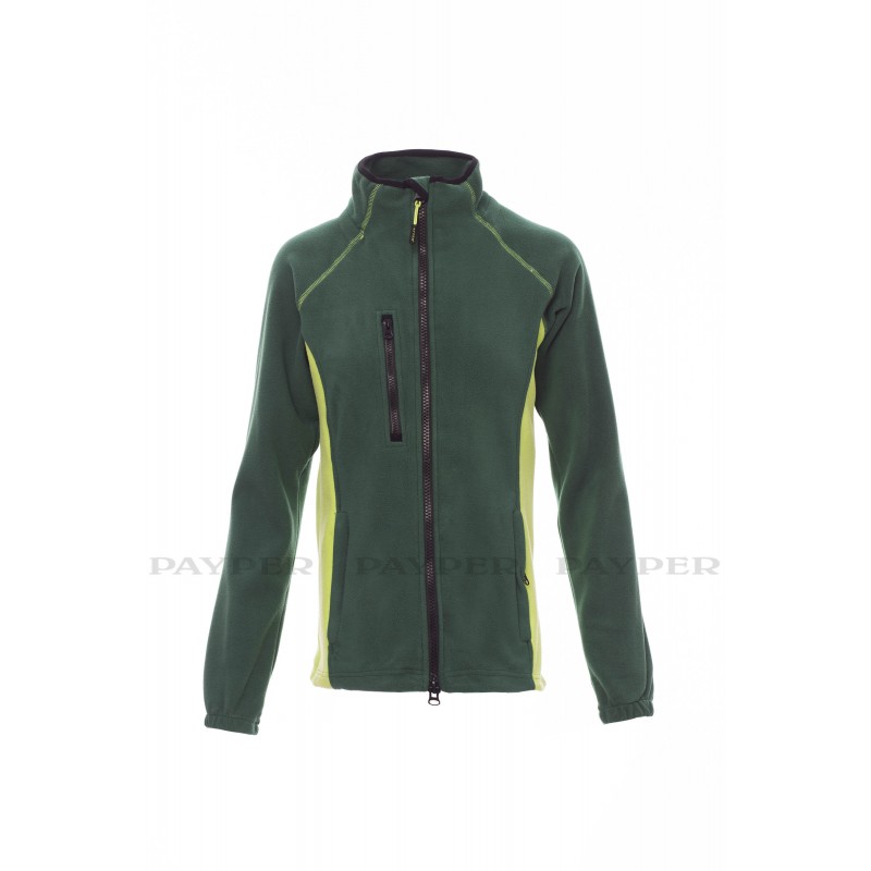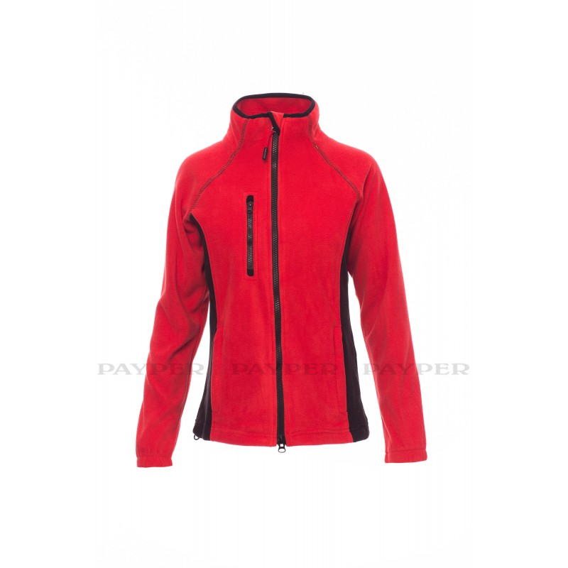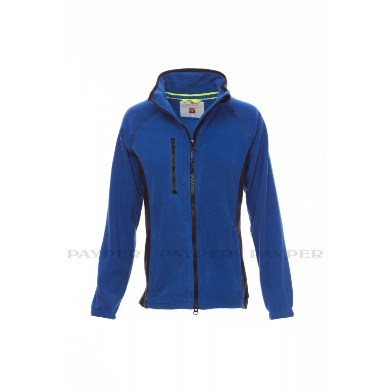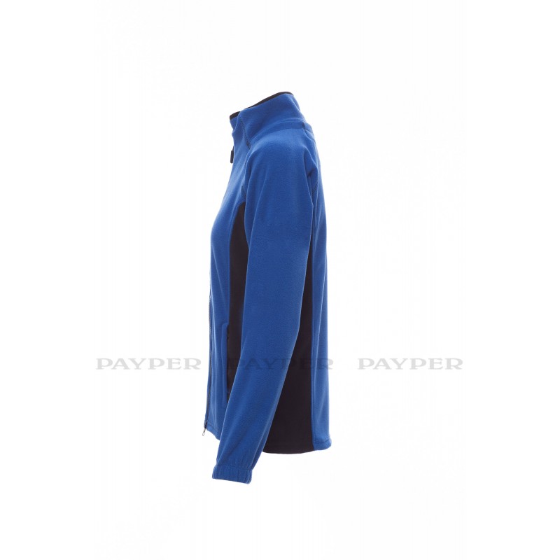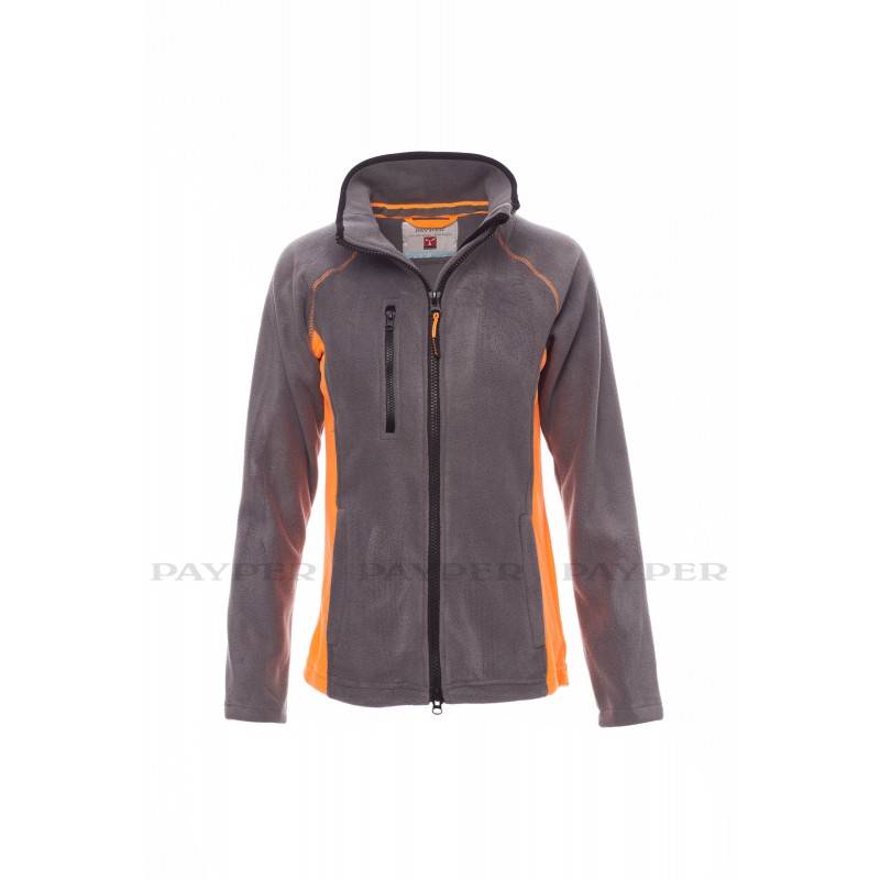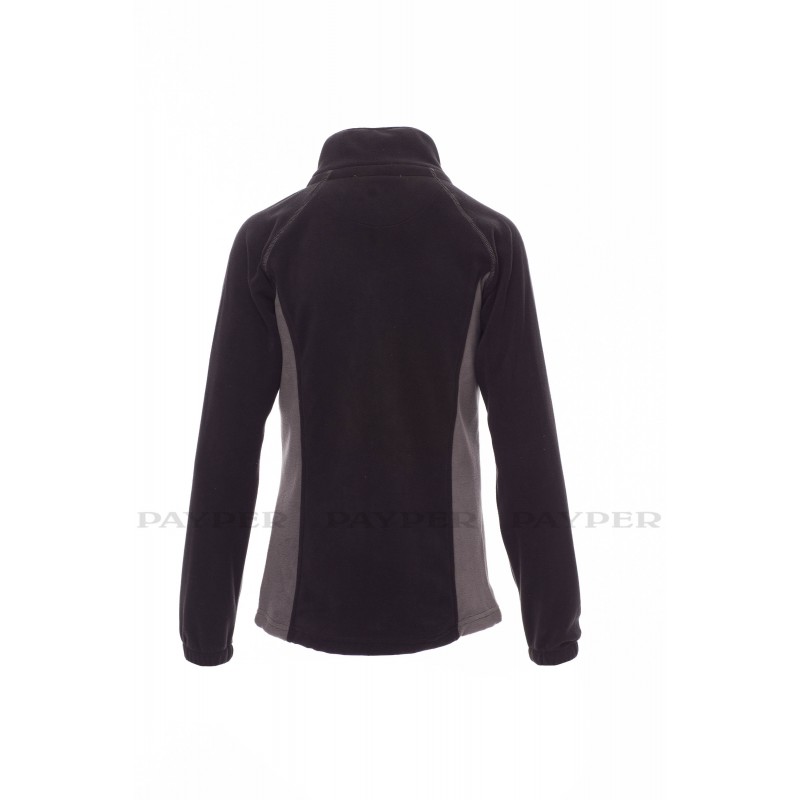 Forro polar ceñido en dos tonalidades para mujer, con cremallera de 8 mm de plástico negra, mangas ranglán, cordón ajustable en la cintura, puños elásticos, dos bolsillos con cremallera oculta, un bolsillo delantero con cremallera, cuello con cinta de refuerzo de contraste, costuras reforzadas.